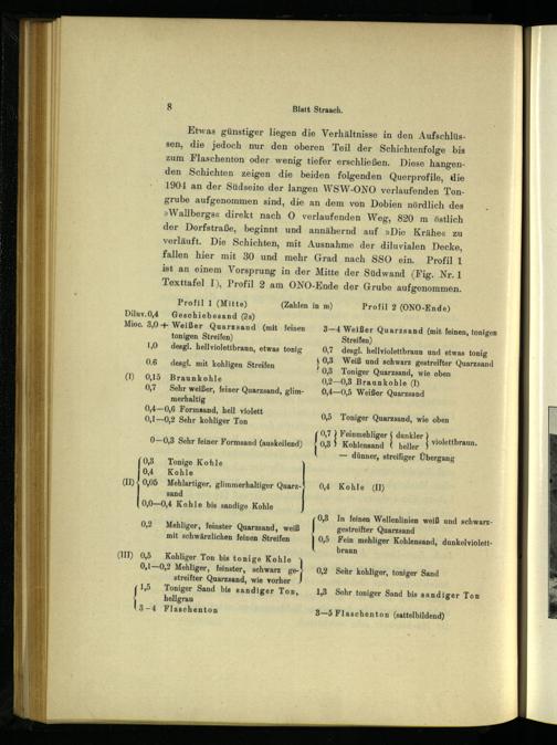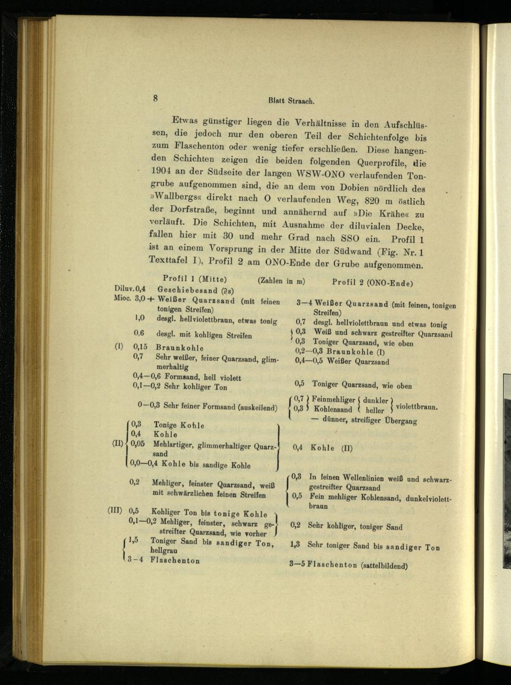 Etwas günstiger liegen die Verhältnisse in den Aufschlüssen, die jedoch nur den oberen Teil der Schichtenfolge bis zum Flaschenton oder wenig tiefer erschließen. Diese hangenden Schichten zeigen die beiden folgenden Querprofile, die 1904 an der Südseite der langen WSW-ONO verlaufenden Tongrube aufgenommen sind, die an dem von Dobien nördlich des »Wallbergs« direkt nach O verlaufenden Weg, 820 m östlich der Dorfstraße, beginnt und annähernd auf»Die Krähe« zu verläuft. Die Schichten, mit Ausnahme der diluvialen Decke, fallen hier mit 30 und mehr Grad nach SSO ein... Profil 1 ist an einem Vorsprung in der Mitte der Südwand(Fig. Nr. 1 Texttafel I), Profil 2. am ONO-Ende. der Grube aufgenommen.