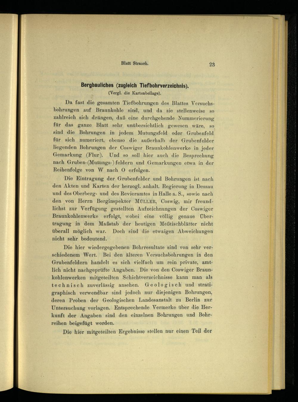 Da fast die gesamten Tiefbohrungen des Blattes Versuchsbohrungen auf Braunkohle sind, und da sie stellenweise so zahlreich sich drängen, daß eine durchgehende Nummerierung für das ganze Blatt sehr unübersichtlich gewesen wäre, so sind die Bohrungen in jedem Mutungsfeld. oder Grubenfeld für sich numeriert, ebenso die außerhalb der Grubenfelder liegenden Bohrungen der Coswiger Braunkohlenwerke in jeder Gemarkung(Flur). Und so soll hier auch die Besprechung nach Gruben-(Mutüungs-) feldern und Gemarkungen etwa in der Reihenfolge von W nach O erfolgen.