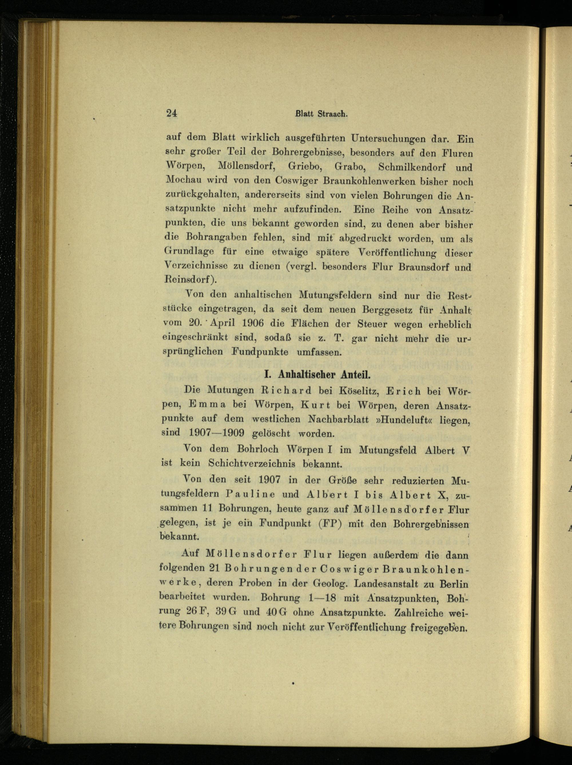 Von den anhaltischen Mutungsfeldern sind nur die Reststücke eingetragen, da seit dem neuen Berggesetz für Anhalt , vom 20.° April 1906 die Flächen der Steuer wegen erheblich eingeschränkt sind, sodaß sie z. T. gar nicht mehr die ursprünglichen Fundpunkte umfassen.