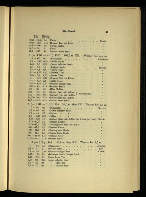 15,0—17,0 2,0»Unreine Kohle« 17,0—19,0 2,0»Dunkelgrauer Sand« 19,0—20,1 1,1»Grauer feiner Sand« 20,1—21,25 1,15»Unreine Kohle« 21,25—21,4 0.15»Grauer Sand« 6(= 1 F.) 1905. 100,0 m über NN. Wasser bei 3,5 m.