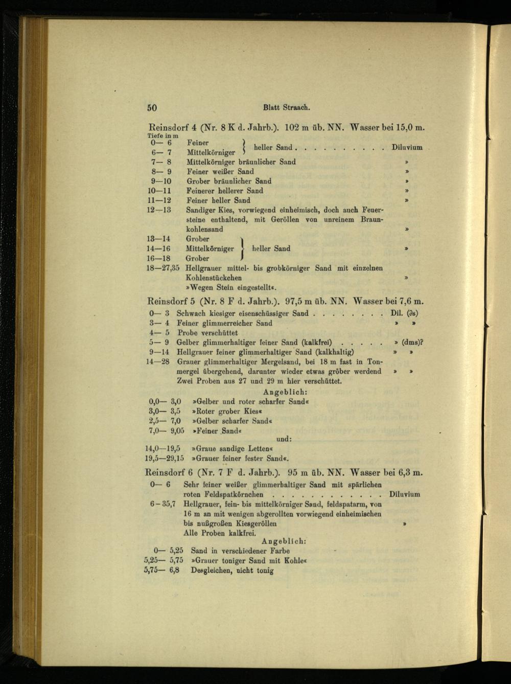 Reinsdorf 4(Nr. 8 K d. Jahrb.). 102 m üb. NN. Wasser bei 15,0 m. Tiefe in m 0— 6 Feiner 6— 7 Mittelkörniger 7— 8 Mittelkörniger bräunlicher Sand 8— 9 Feiner weißer Sand 9—10 Grober bräunlicher Sand 10—11 Feinerer hellerer Sand 11—12 Feiner heller Sand 12—13 Sandiger Kies, vorwiegend einheimisch, doch auch Feuersteine enthaltend, mit Geröllen von unreinem Braunkohlensand 13—14 Grober 14—16 Mittelkörniger| heller Sand 16—18 Grober 18—27,35 Hellgrauer mittel- bis grobkörniger Sand mit einzelnen Kohlenstückchen »Wegen Stein eingestellt«.