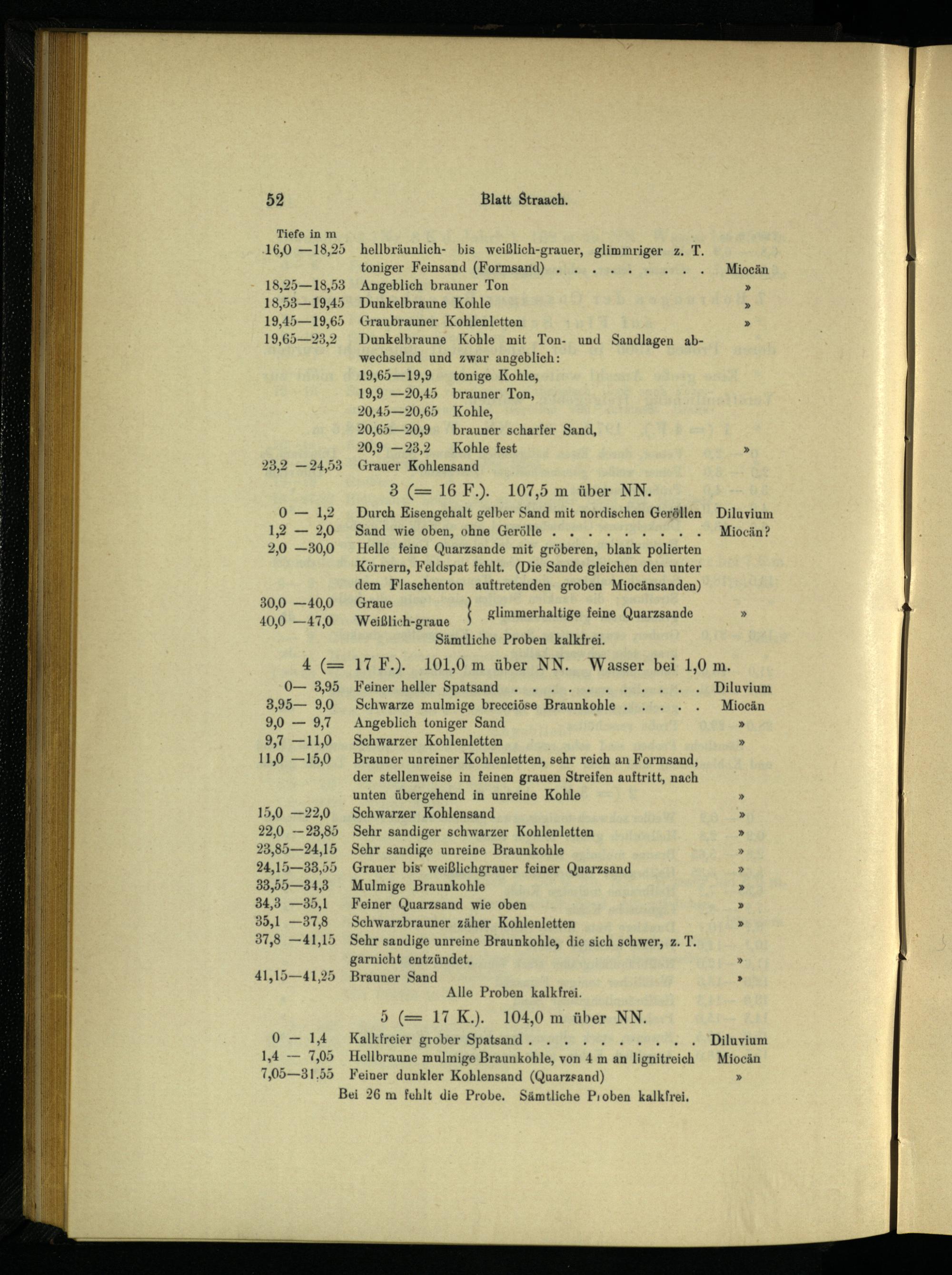 5(== 17 K.). 104,0 m über NN. Kalkfreier grober Spatsand.. Hellbraune mulmige Braunkohle, von 4 m an np Hgnitreich Feiner dunkler Kohlensand(Quarzsand) Sämtliche Pıoben kalkfrei,