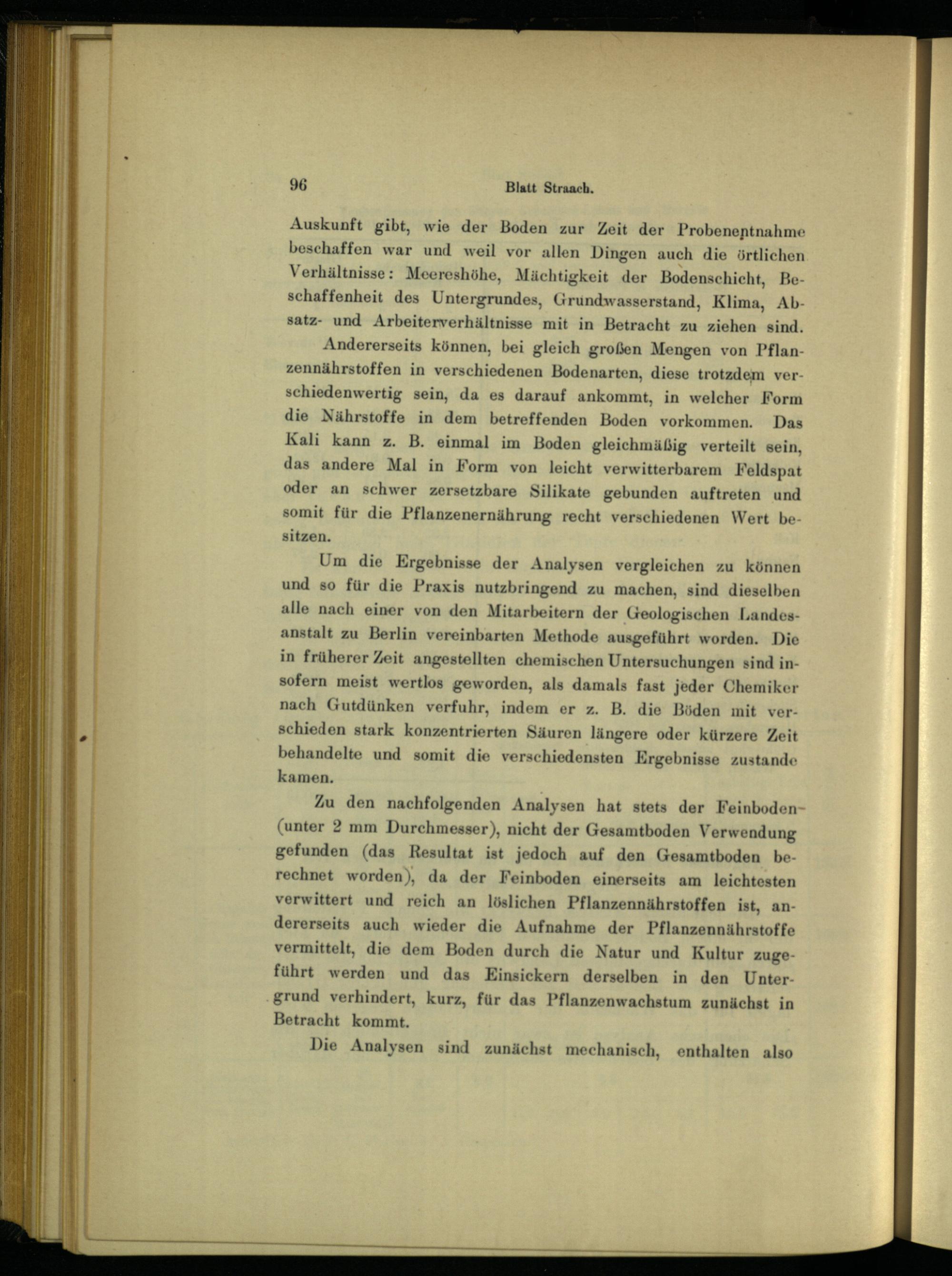 Zu den nachfolgenden Analysen hat stets der Feinboden(unter 2 mm Durchmesser), nicht der Gesamtboden Verwendung gefunden(das Resultat ist jedoch auf den Gesamtboden berechnet worden), da der Feinboden einerseits am leichtesten verwittert und reich an löslichen Pflanzennährstoffen ist, andererseits auch wieder die Aufnahme der Pflanzennährstoffe vermittelt, die dem Boden durch die Natur und Kultur zugeführt werden und das KEinsickern derselben in den Untergrund verhindert, kurz, für das Pflanzenwachstum zunächst in Betracht kommt.