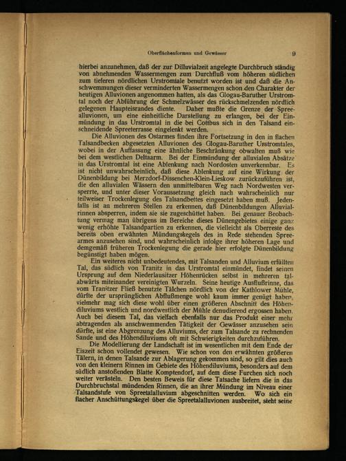 ‘hierbei anzunehmen, daß der.zur Dilluvialzeit angelegte Durchbruch ständig ‘von abnehmenden Wassermengen zum /Durchfluß vom höheren. südlichen zum tieferen nördlichen Urströmtale benutzt worden ist und daß die Anschwemmungen dieser verminderten Wassermengen schon.den Charakter der heutigen Alluvionen angenommen hatten, als das Glogau-Baruther Urstromtal noch der Abführung der Schmelzwässer des rückschmelzenden nördlich gelegenen Haupteisrandes diente. Daher mußte die Grenze. der Spreealluvionen, um eine einheitliche Darstellung zu erlangen, bei der Einmündung in das Urstromtal in die bei Cottbus sich in den Talsand einschneidende Spreeterrasse eingelenkt werden: