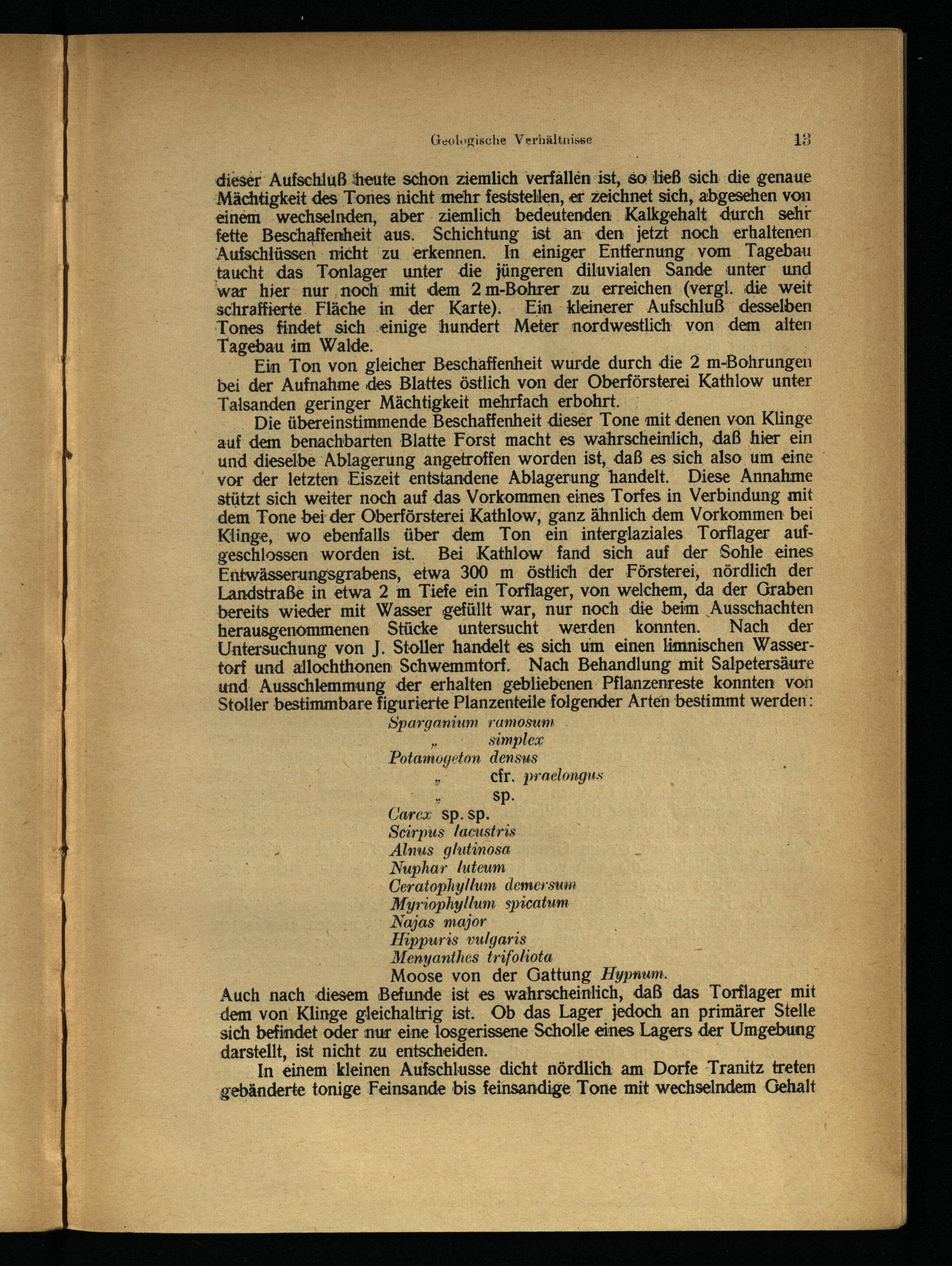 Die übereinstimmende Beschaffenheit dieser Tone mit denen von Klinge auf dem benachbarten Blatte Forst macht es wahrscheinlich, daß hier ein und dieselbe Ablagerung angetroffen worden ist, daß es sich also um eine vor der letzten Eiszeit entstandene Ablagerung handelt. Diese Annahme stützt sich weiter noch auf das Vorkommen eines Torfes in Verbindung mit dem Tone bei der Oberförsterei Kathlow, ganz ähnlich dem Vorkommen bei Klinge, wo ebenfalls über dem Ton ein interglaziales Torflager aufgeschlossen worden ist. Bei Kathlow fand sich auf der Sohle eines Entwässerungsgrabens, etwa 300 m Östlich der Försterei, nördlich der Landstraße in etwa 2 m Tiefe ein Torflager, von welchem, da der Graben bereits wieder mit Wasser gefüllt war, nur noch die beim Ausschachten herausgenommenen Stücke untersucht werden konnten. Nach der Untersuchung von J. Stoller handelt es sich um einen limnischen Wassertorf und allochthonen Schwemmtorf. Nach Behandlung mit Salpetersäure und Ausschlemmung der erhalten gebliebenen Pflanzenreste konnten von Stoller bestimmbare figurierte Planzenteile folgender Arten bestimmt werden: