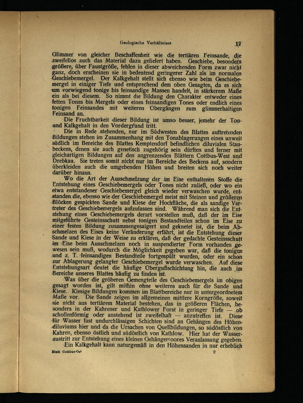 und Kalkgehalt in den Vordergrund tritt. Die in Rede ‚stehenden, ‚nur im Südwesten des Blattes auftretenden Bildungen stehen im Zusammenhang mit den Tonablagerungen eines unweit südlich im Bereiche des Blattes Kemptendorf befindlichen ‚diluvialen Staubeckens, denen sie auch genetisch zugehörig sein dürften und ferner mit gleichartigen Bildungen auf den angrenzenden Blättern Cottbus-West und Drebkau . Sie treten somit nicht nur im Bereiche des Beckens auf, sondern überkleiden auch die umgebenden Höhen und breiten sich noch weiter darüber hinaus.;
