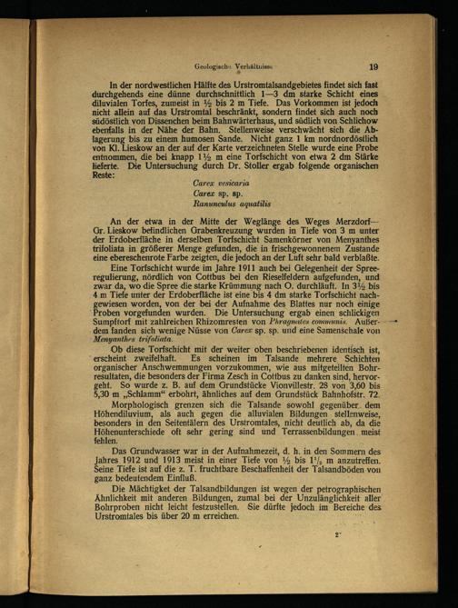 In der nordwestlichen Hälfte des Urstromtalsandgebietes findet sich fast durchgehends eine dünne durchschnittlich 1—3 dm starke Schicht eines Cihvinlen Torfes , zumeist in% bis 2 m Tiefe. Das Vorkommen ist jedoch nicht allein auf das Urstromtal beschränkt, sondern findet sich auch noch "südöstlich von Dissenchen beim Bahnwärterhaus, und südlich von Schlichow ebenfalls in der Nähe der Bahn. Stellenweise. verschwächt sich die Ablagerung bis zu einem humosen Sande. Nicht ganz 1 km nordnordöstlich ‚von Kl. Lieskow an der auf der Karte verzeichneten Stelle wurde eine Probe entnommen, die bei knapp 1% m eine Torfschicht von etwa 2 dm Stärke lieferte. Die Untersuchung durch Dr. Stoller ergab folgende organischen Reste:;;