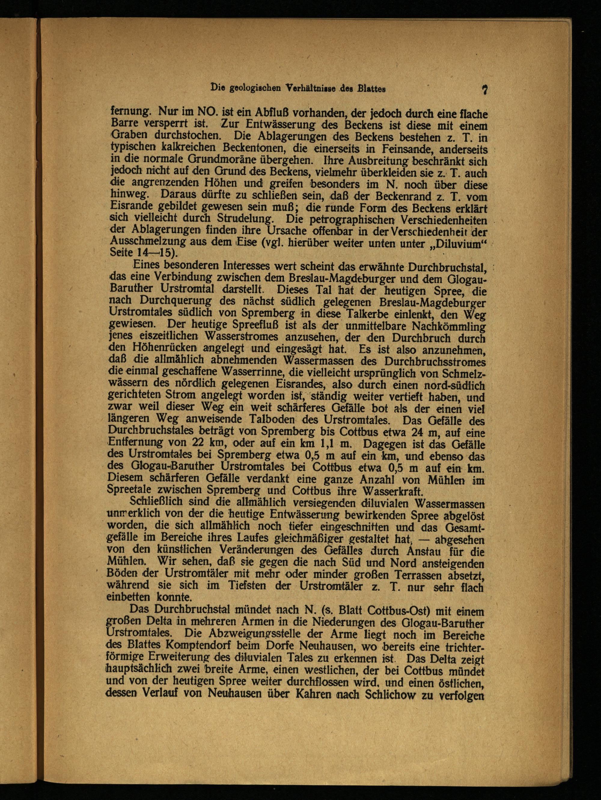 Das Durchbruchstal mündet nach N.(s. Blatt Cottbus -Ost) mit einem großen Delta in mehreren Armen in die Niederungen des Glogau -Baruther Urstromtales. Die Abzweigungsstelle der Arme liegt noch im Bereiche des Blattes Komptendorf beim Dorfe Neuhausen, wo bereits eine trichterförmige Erweiterung des diluvialen Tales zu erkennen ist. Das Delta zeigt hauptsächlich zwei breite Arme, einen westlichen, der bei Cottbus mündet und von der heutigen Spree weiter durchflossen wird, und einen östlichen, dessen Verlauf von Neuhausen über Kahren nach Schlichow zu verfolgen