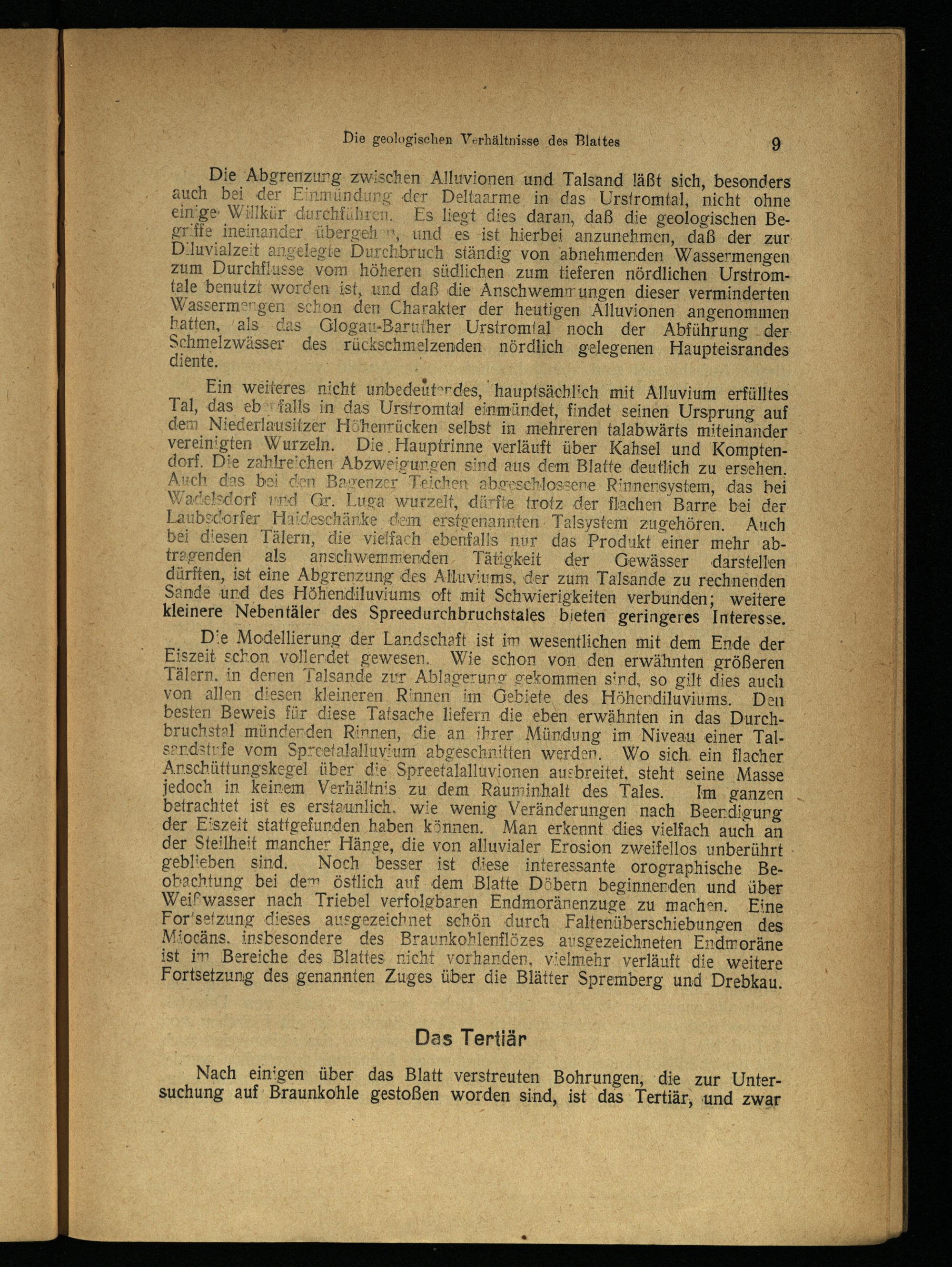 Die Modellierung der Landschaft ist im wesentlichen mit dem Ende der Eiszeit schon vollerdet gewesen. Wie schon von den erwähnten größeren Tälern, in denen Talsande zur Ablagerung gekommen sind, so gilt dies auch von allen diesen kleineren. Rinnen im Gebiete des. Höherdiluviums. Den besten Beweis für diese Tatsache liefern die eben erwähnten in das Durchbruchstal münderden Rinnen, die an ihrer Mündung im Niveau einer Talsardstrfe vom Spreetalalluvium abgeschnitten werden... Wo sich. ein flacher Anschüttungskegel üb lie Spreetalallıvionen ausbreitet, steht seine Masse jedoch in keinem Verhältnis zu dem Rauminhalt des Tales. Im ganzen betrachtet ist es erstaunlich, wie wenig Veränderungen nach Beerdigung der Eiszeit stattgefunden haben können. Man erkennt dies vielfach auch an der Steilheit mancher Hänge, die von alluvialer Erosion zweifellos unberührt geblieben sind. Noch besser ist diese interessante orographische Beobachtung bei dem östlich auf.dem Blatte Döbern beginnenden und über Weißwasser nach Triebel verfolgbaren Endmoränenzuge zu machen. Eine For’setzung dieses ausgezeichnet schön durch Faltenüberschiebungen des Miocäns, insbesondere des Braunkohlenflözes ausgezeichneten Endmoräne ist im Bereiche des Blattes nicht vorhanden, vielmehr. verläuft die weitere Fortsetzung des genannten Zuges über die Blätter Spremberg und Drebkau .