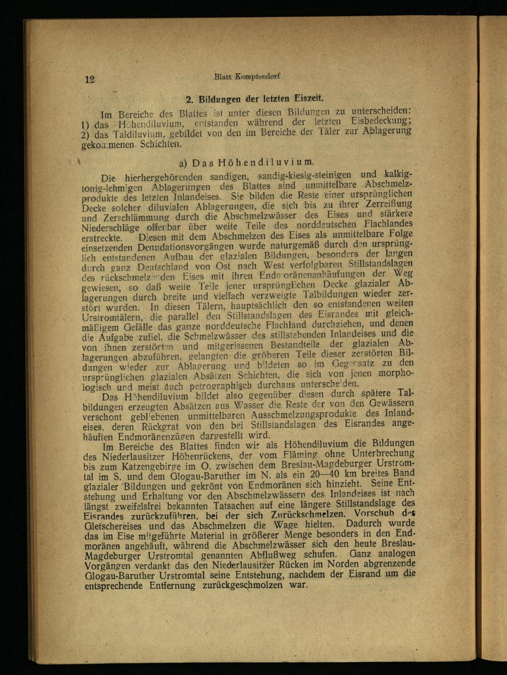 Im Bereiche des Blattes ist unter diesen Bildungen zu unterscheiden: 1) das-Höhendiluvium, entstanden während der- letzten Eisbedeckung;