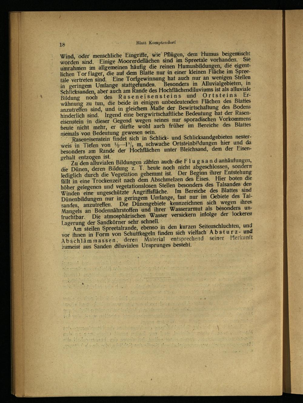 Am steilen Spreetalrande, ebenso in den kurzen Seitenschluchten, und vor ihnen in Form von Schuttkegeln finden sich vielfach‘ Absturz- und Abschlämmassen, deren Material: entsprechend seiner Herkunft zumeist aus Sanden diluvialen Ursprunges besteht..;