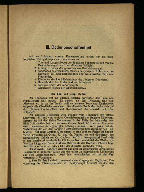 Der Tonboden tritt auf unseren Blättern gegenüber dem Sand und Humusboden. sehr. zurück... Er gehört teils dem Diluvium,. teils dem Alluvium an, da die im Tertiär weit. verbreiteten Tone und Kohlenletten nirgends die Oberfläche erreichen. Der diluviale Tonboden findet sich auf den‘ Blättern. Cottbus -West und Komptendorf, der alluviale auf..allen 3 Blättern.