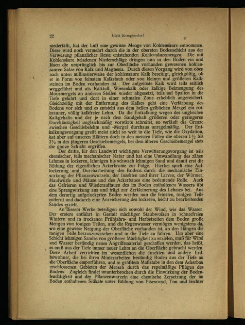 Der dritte, für den Landwirt wichtigste Verwitterungsvorgang ist-teils ehemischer, teils mechanischer Natur und hat eine Umwandlung des zähen Lehmes in lockeren, lehmigen bis schwach lehmigen Sand und damit erst die Bildung der eigentlichen Ackerkrume zur Folge. Hierbei spielt eine Auflockerung ‚und Durcharbeitung. des Bodens. durch die mechanische Einwirkung der Pflanzenwurzeln, der Insekten und ihrer Larven, der Würmer, Maulwürfe und Mäuse und des Ackerbaues eine bedeutende Rolle. Auch das Gefrieren und Wiederauftauen des im Boden enthaltenen Wassers übt eine Sprengwirkung aus und trägt zur Zerkleinerung des Lehmes bei. Aus dem derartig aufgelockerten Boden werden nun die feinsten, tonigen Teile entfernt und dadurch eine Anreicherung des lockeren, leicht zu bearbeitenden Sandes erzielt.