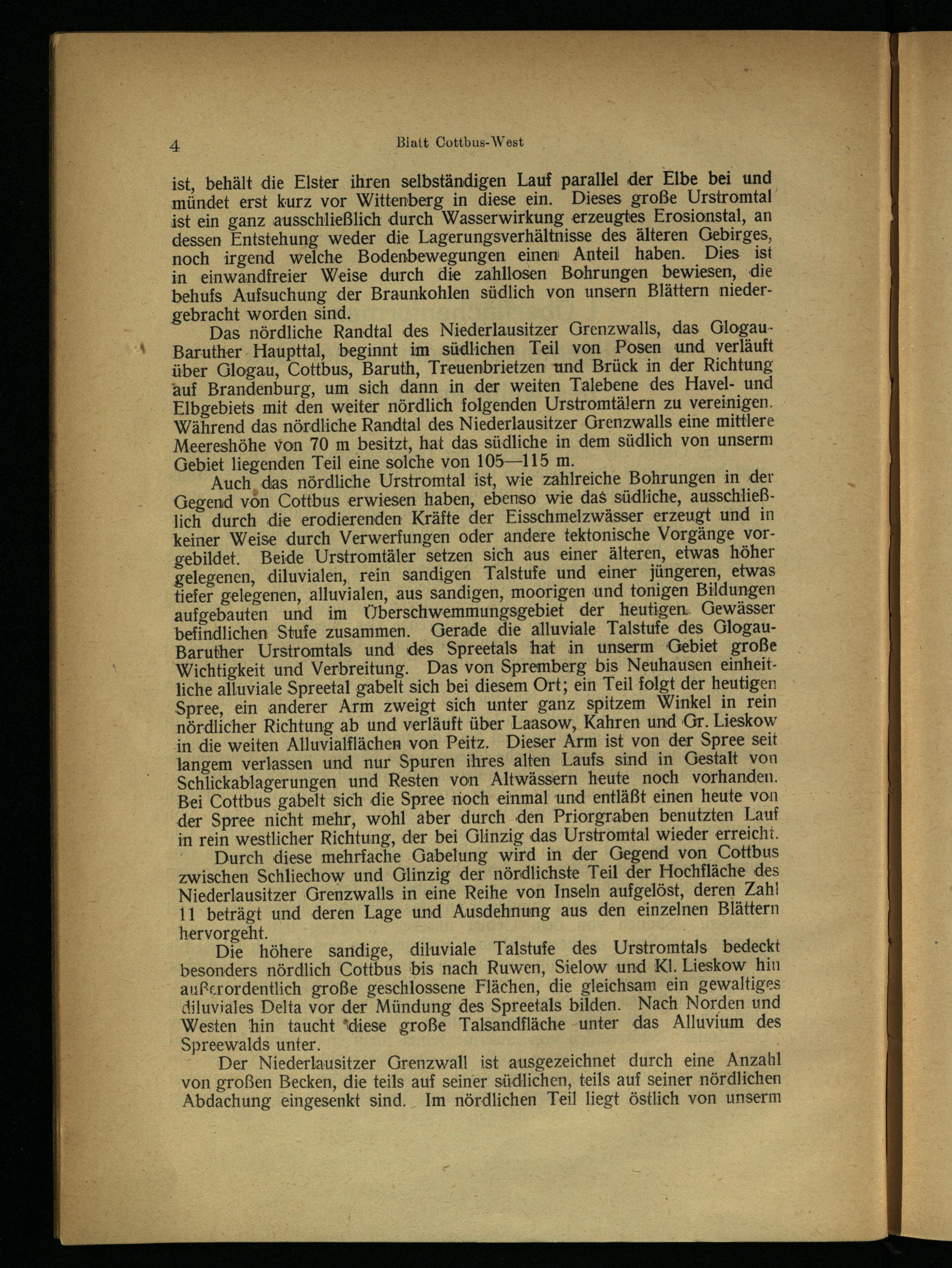 Die höhere sandige, diluviale Talstufe des Urstromtals bedeckt besonders nördlich Cottbus bis nach Ruwen, Sielow und Kl. Lieskow hin außerordentlich große geschlossene Flächen, die gleichsam ein gewaltiges diluviales Delta vor der Mündung des Spreetals bilden. Nach Norden und Westen hin taucht“diese große Talsandfläche-unter das Alluvium des Spreewalds unter.;