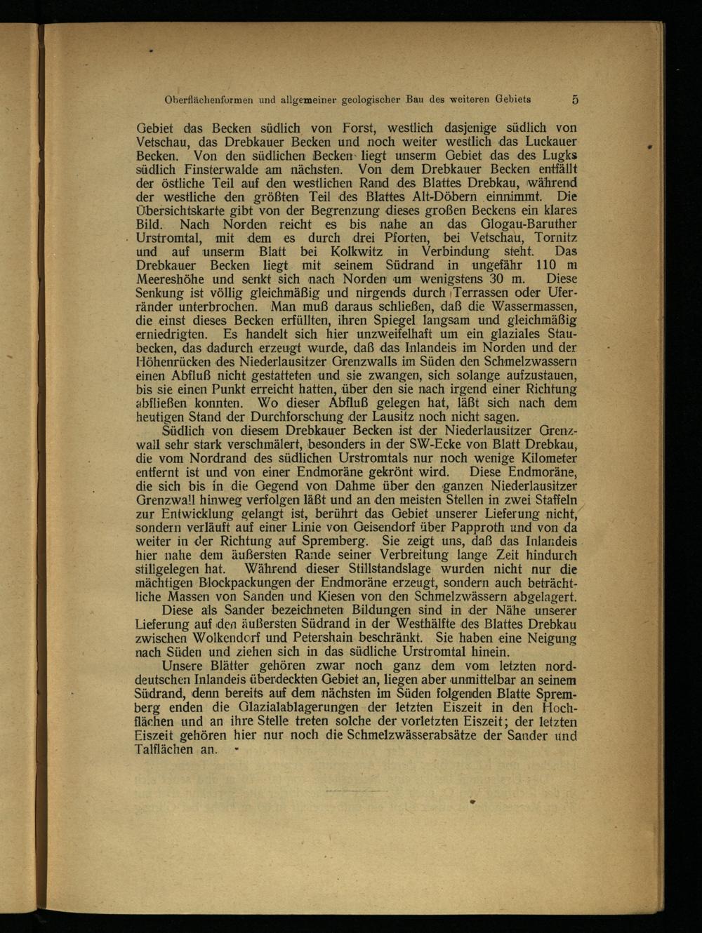 Unsere Blätter gehören zwar noch ganz dem vom letzten norddeutschen Inlandeis überdeckten Gebiet an, liegen aber unmittelbar an seinem Südrand, denn bereits auf dem nächsten im Süden folgenden Blatte Sprem berg enden die Glazialablagerungen ‚der letzten Eiszeit in den Hochflächen und an ihre Stelle treten solche der vorletzten Eiszeit; der letzten Eiszeit gehören hier nur noch die Schmelzwässerabsätze der Sander und Talflächen an.