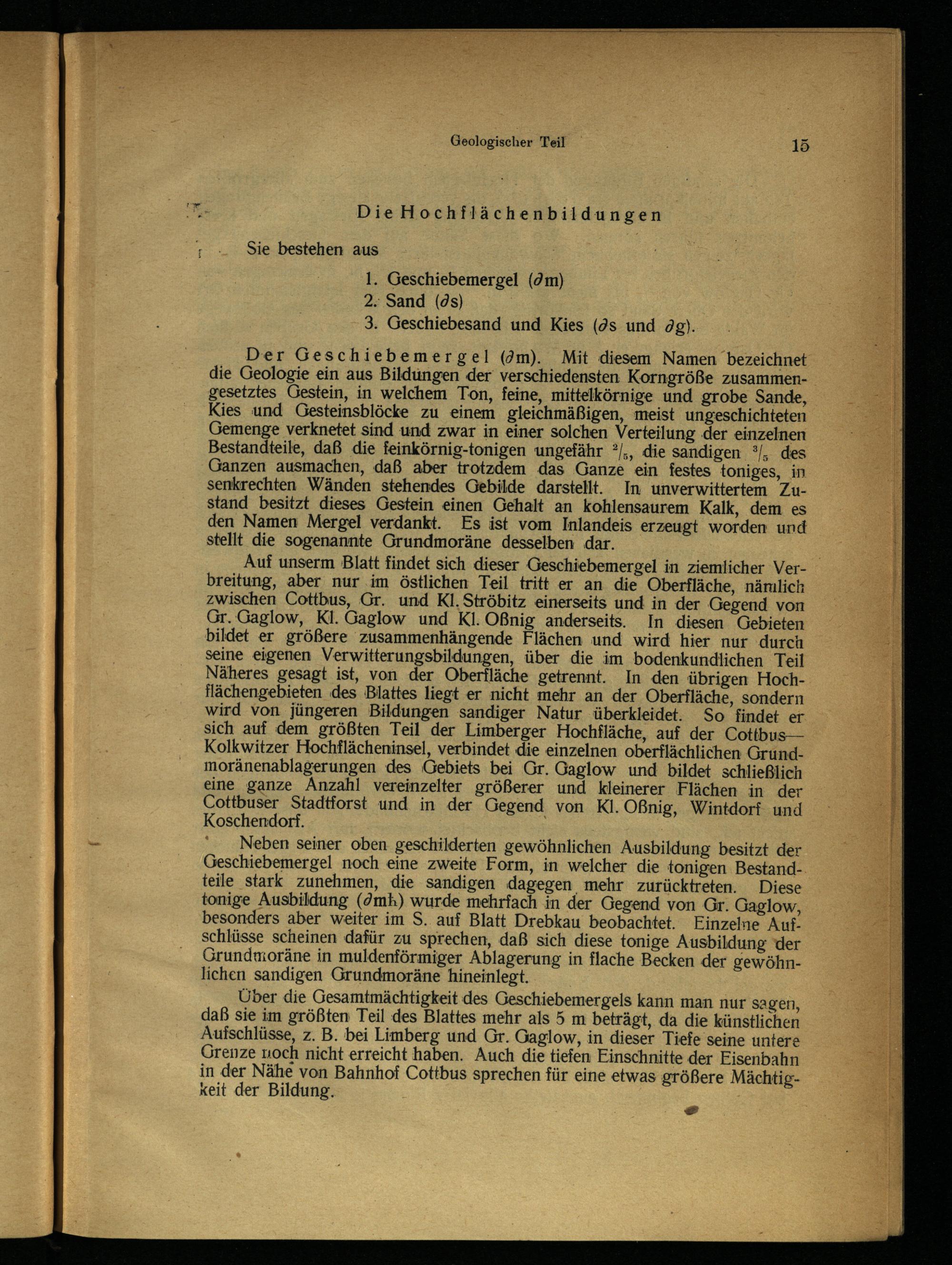 breitung, aber nur im östlichen Teil tritt er an die Oberfläche, nämlich zwischen Cottbus , Gr. und Kl. Ströbitz einerseits und in der Gegend von Gr. Gaglow, Kl. Gaglow und Kl. Oßnig anderseits. In diesen Gebieten bildet er größere zusammenhängende Flächen und wird hier nur durch seine eigenen Verwitterungsbildungen, über die im bodenkundlichen Teil Näheres gesagt ist, von der Oberfläche getrennt. In den übrigen Hochflächengebieten des Blattes liegt er nicht mehr an der Oberfläche, sondern wird von jüngeren Bildungen sandiger Natur überkleidet. So findet er sich auf dem größten Teil der Limberger Hochfläche, auf der Cottbus — Kolkwitzer Hochflächeninsel, verbindet die einzelnen oberflächlichen Grundmoränenablagerungen des Gebiets bei Gr. Gaglow und bildet schließlich eine ganze Anzahl vereinzelter größerer und kleinerer Flächen in der Cottbuser Stadtforst und in der Gegend von Kl. Oßnig, Wintdorf- und Koschendorf.;