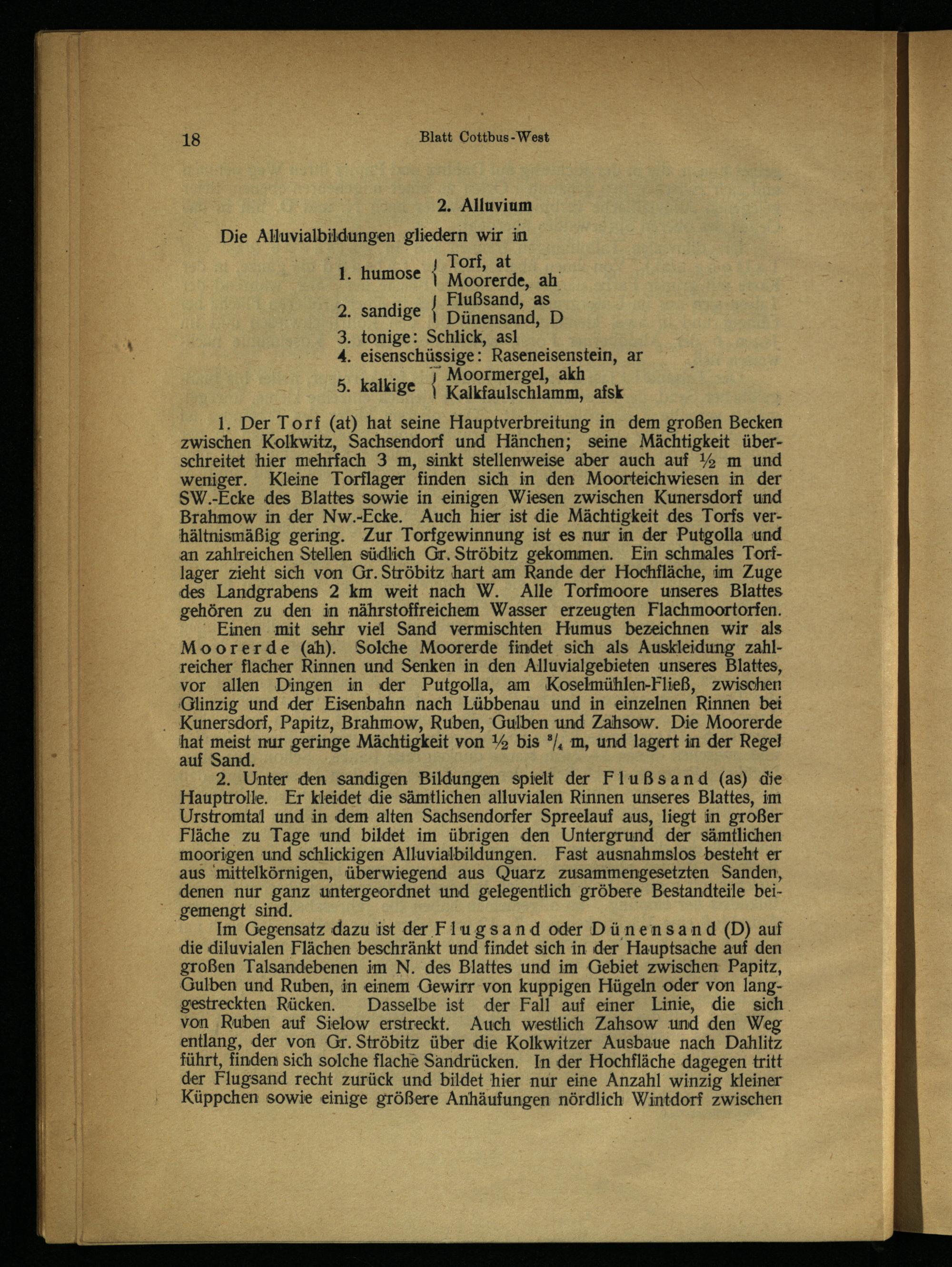 1. Der Torf(at) hat seine Hauptverbreitung in dem großen Becken zwischen Kolkwitz , Sachsendorf und Hänchen; seine Mächtigkeit überschreitet hier mehrfach 3 m, sinkt stellenweise aber auch auf% m und weniger. Kleine Torflager finden sich in den Moorteichwiesen in der SW.-Ecke des Blattes sowie in einigen Wiesen zwischen Kunersdorf und Brahmow in der Nw.-Ecke. Auch hier ist die Mächtigkeit des Torfs verhältnismäßig gering. Zur Torfgewinnung ist es nur in der Putgolla und an zahlreichen Stellen südlich Gr. Ströbitz gekommen. Ein schmales Torflager zieht sich von Gr. Ströbitz hart am Rande der Hochfläche, im Zuge des Landgrabens 2 km weit nach W. Alle Torfmoore unseres Blattes gehören zu den in nährstoffreichem Wasser erzeugten Flachmoortorfen.