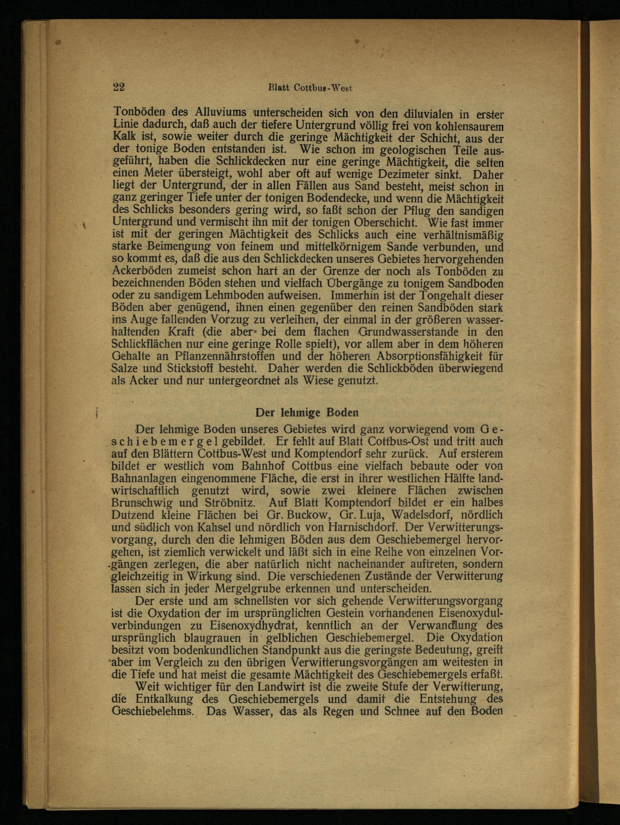Der lehmige Boden unseres Gebietes wird ganz vorwiegend vom Geschiebemergel gebildet. Er fehlt auf Blatt Cottbus -Ost und tritt auch auf den Blättern Cottbus-West und Komptendorf sehr zurück. Auf ersterem bildet er westlich vom Bahnhof Cottbus eine vielfach bebaute oder von Bahnanlagen eingenommene Fläche, die erst in ihrer westlichen Hälfte landwirtschaftlich genutzt wird, sowie zwei kleinere Flächen zwischen Brunschwig und Ströbnitz. Auf Blatt Komptendorf bildet er ein halbes Dutzend kleine Flächen bei Gr. Buckow, Gr. Luja, Wadelsdorf, nördlich und südlich von Kahsel und nördlich von Harnischdorf. Der Verwitterungsvorgang, durch den die lehmigen Böden aus dem Geschiebemergel hervorgehen, ist ziemlich verwickelt und läßt sich in eine Reihe von einzelnen Vor.‚gängen zerlegen, die aber natürlich nicht nacheinander auftreten, sondern gleichzeitig in Wirkung sind. Die verschiedenen Zustände der Verwitterung lassen sich in jeder Mergelgrube erkennen und unterscheiden.
