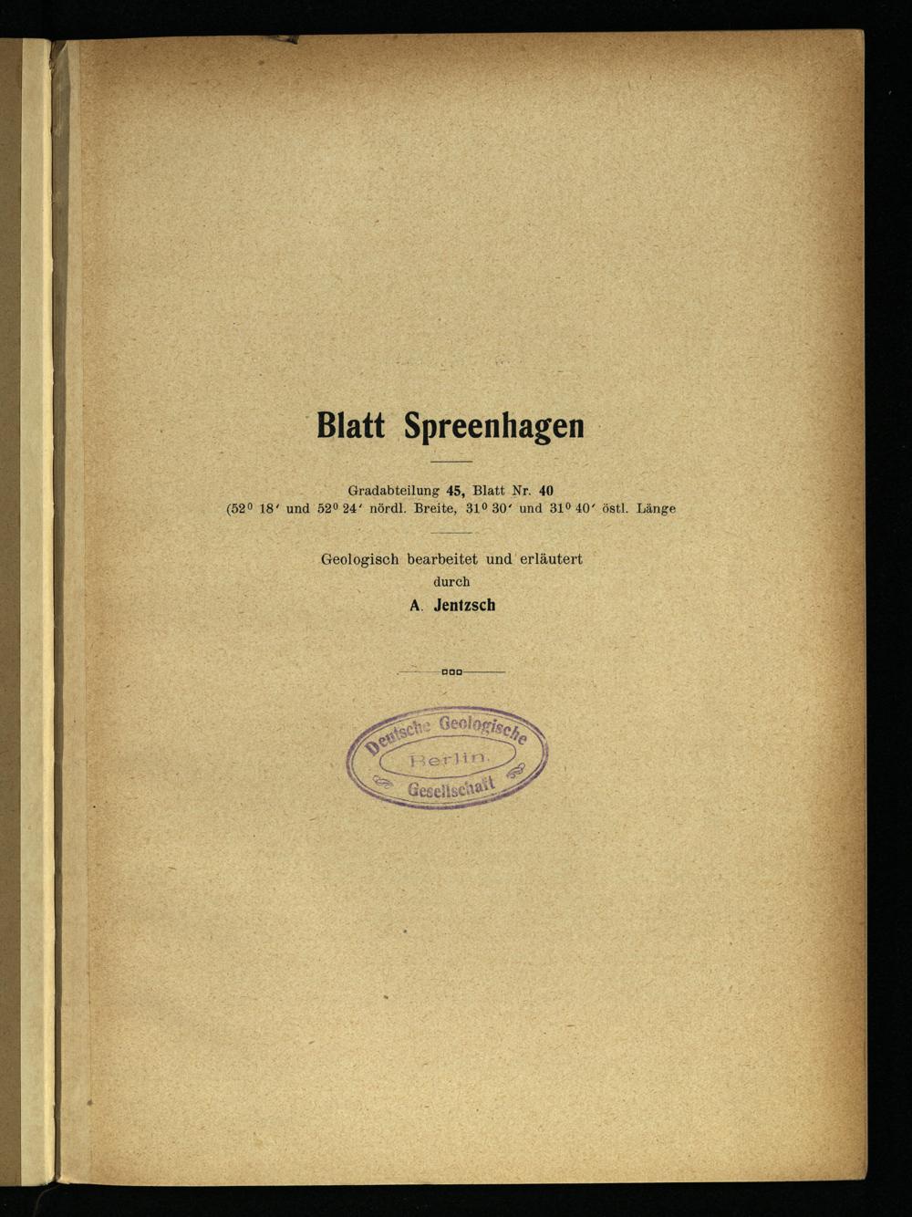 Blatt Spreenhagen Gradabteilung 45, Blatt Nr. 40 (520 18‘ und 52° 24‘ nördl. Breite, 31° 30‘ und 31° 40‘ östl. Länge Geologisch bearbeitet und erläutert durch A. Jentzsch