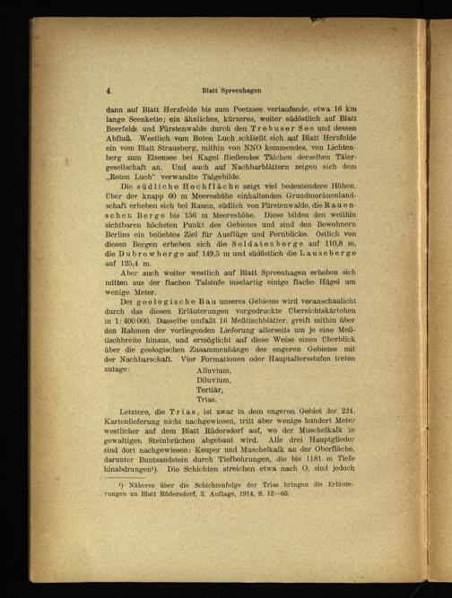 Letztere, die Trias, ist zwar in dem engeren Gebiet der 224. Kartenlieferung nicht nachgewiesen, tritt aber wenige hundert Meter westlicher auf dem Blatt Rüdersdorf auf, wo der Muschelkalk in gewaltiger. Steinbrüchen abgebaut wird. Alle drei Hauptglieder sind dort nachgewiesen: Keuper und Muschelkalk an der Oberfläche, darunter Buntsandstein durch. Tiefbohrungen, die bis 1181 m Tiefe hinabdrangen!). Die Schichten streichen etwa nach O, sind jedoch