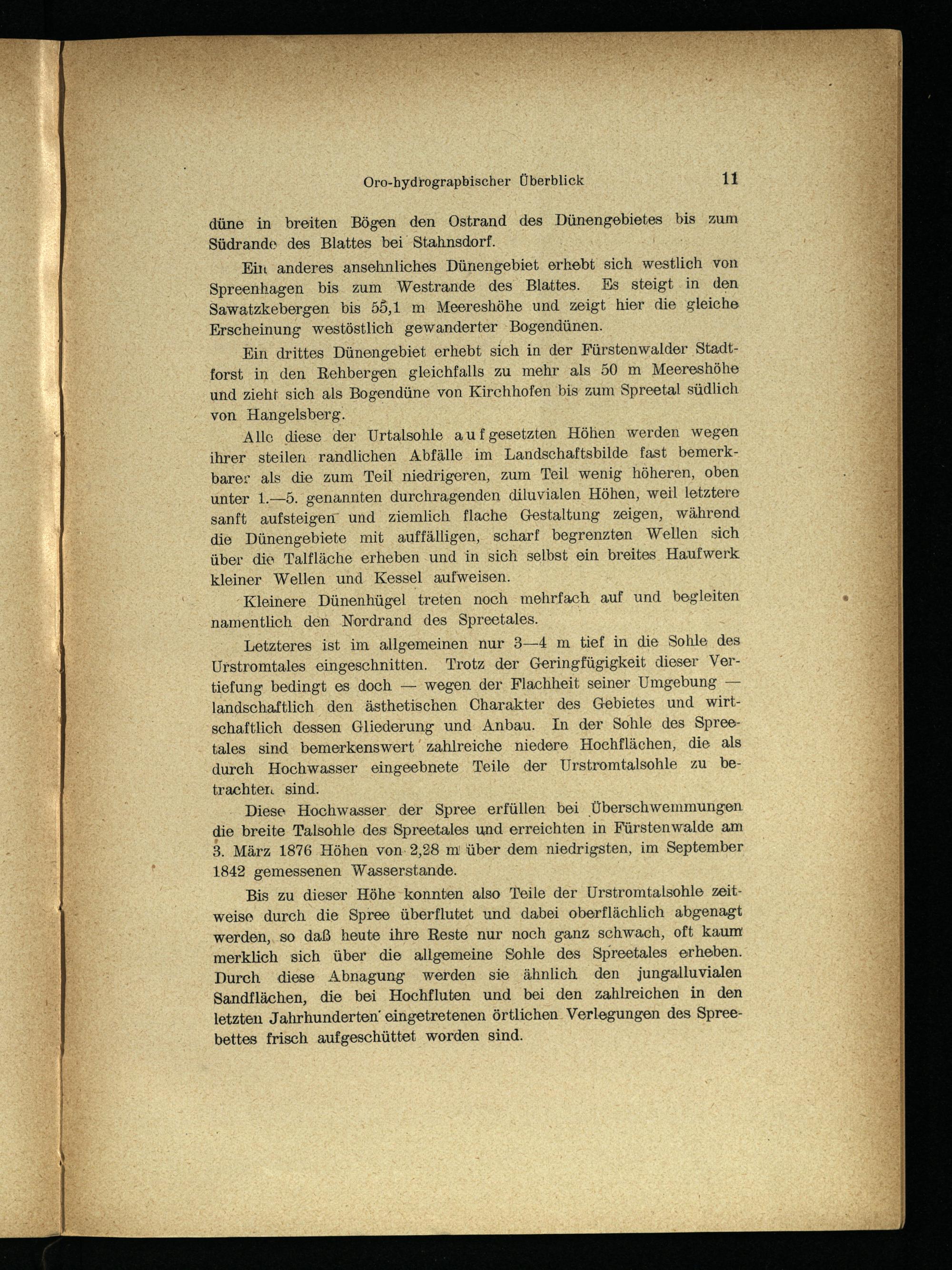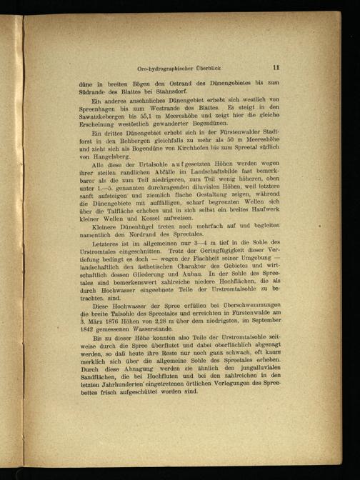 Bis zu dieser Höhe konnten also Teile der Urstromtalsohle zeitweise durch die Spree überflutet und dabei oberflächlich abgenagt werden,. so daß heute ihre Reste nur noch ganz schwach, oft kaum merklich sich über die allgemeine Sohle des Spreetales erheben. Durch diese Abnagung werden sie ähnlich ‚den jungalluvialen Sandflächen, die bei Hochfluten und bei den zahlreichen in den letzten Jahrhunderten‘ eingetretenen örtlichen. Verlegungen des Spreebettes frisch aufgeschüttet worden sind.