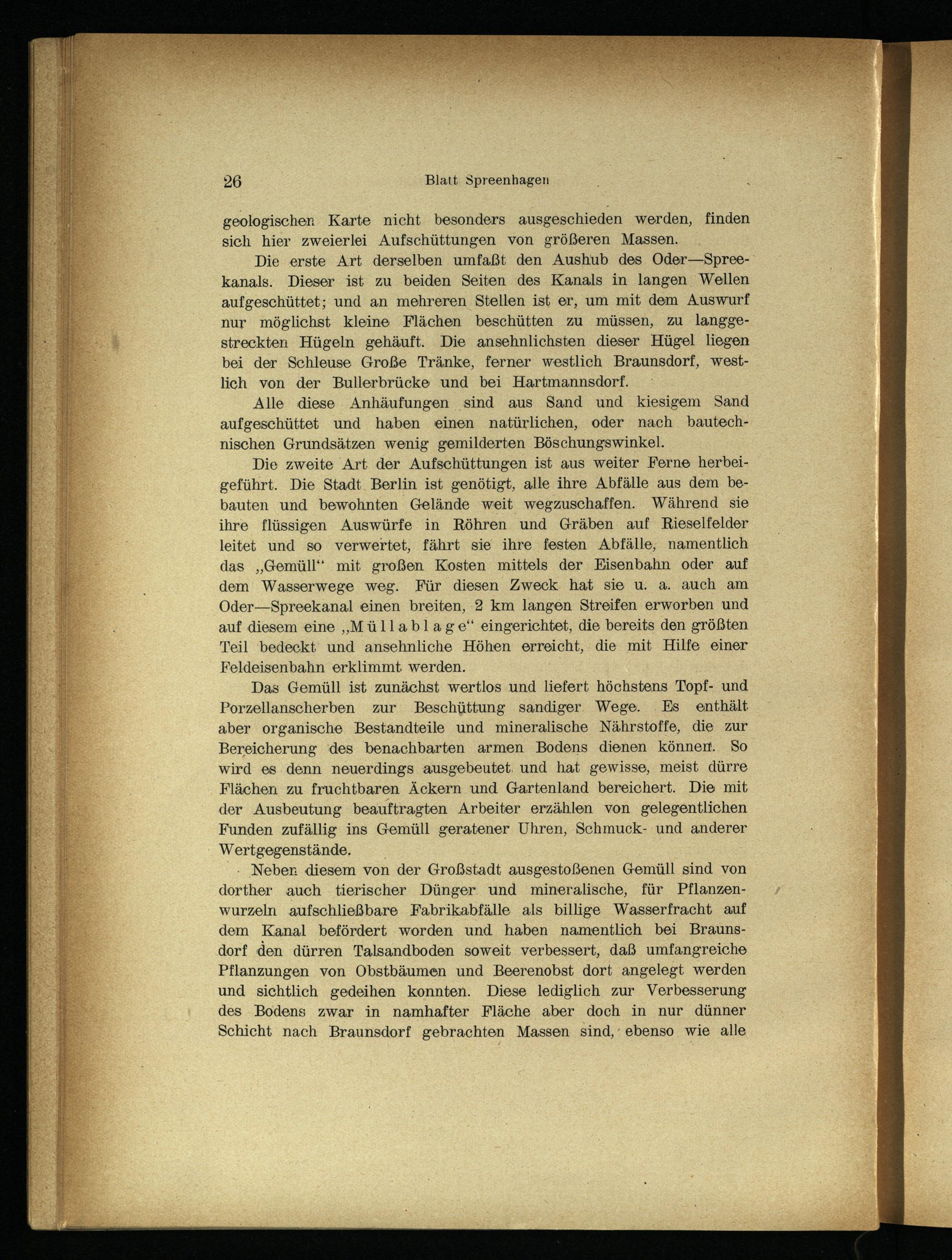 Neber. diesem von der Großstadt ausgestoßenen Gemüll sind von dorther auch tierischer Dünger und mineralische, für Pflanzenwurzeln aufschließbare Fabrikabfälle als billige Wasserfracht auf dem Kanal befördert worden und haben namentlich bei Braunsdorf den dürren Talsandboden soweit verbessert, daß umfangreiche Pflanzungen von Obstbäumen und Beerenobst dort angelegt werden und sichtlich gedeihen konnten. Diese lediglich zur Verbesserung des Bodens zwar in namhafter Fläche aber doch in nur dünner Schicht nach Braunsdorf gebrachten Massen sind, ebenso wie alle