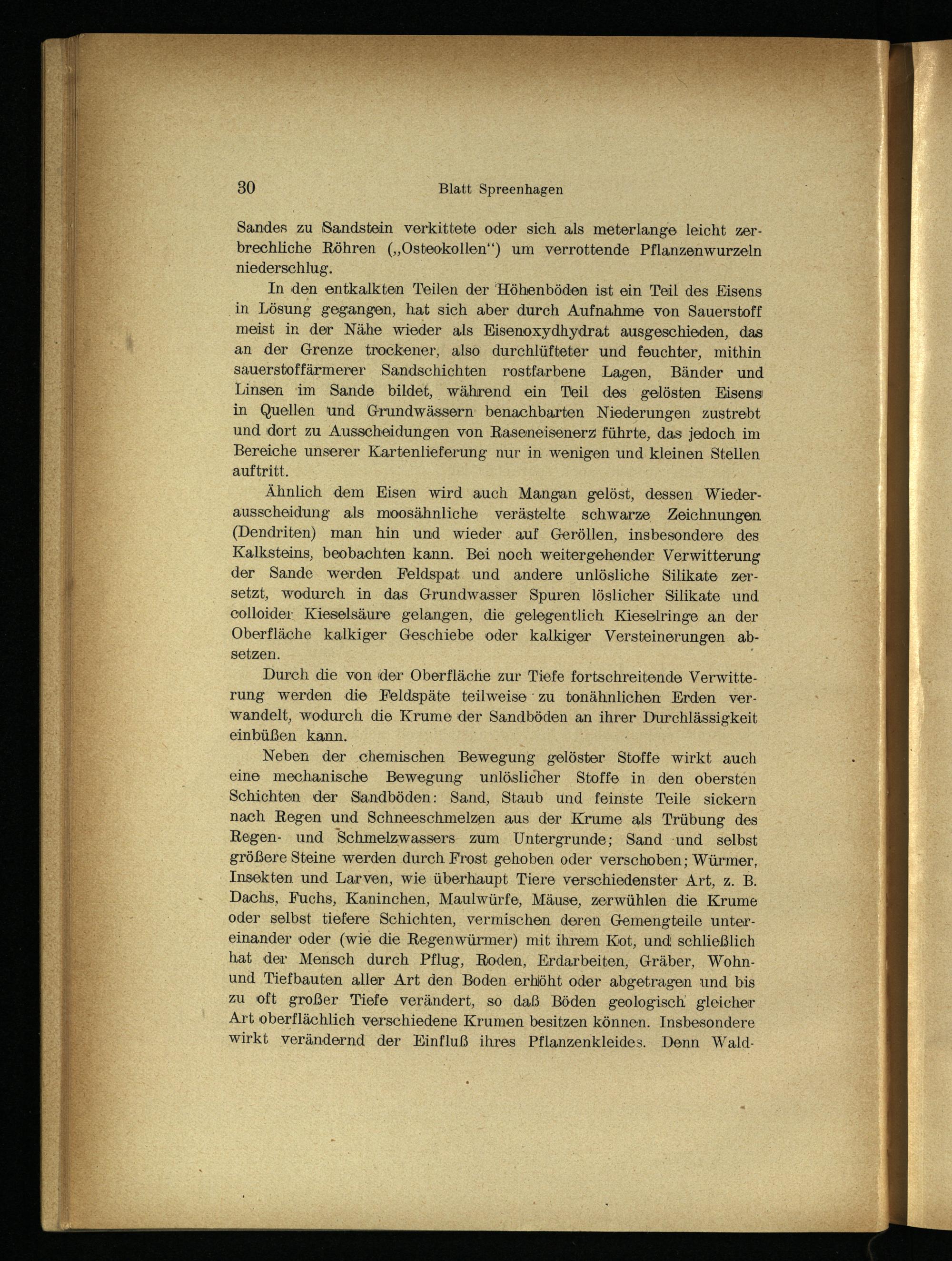 In den entkalkten Teilen der Höhenböden ist ein Teil des Eisens in Lösung gegangen, hat sich aber durch Aufnahme von Sauerstoff meist in der Nähe wieder als Eisenoxydhydrat ausgeschieden, das an der Grenze trockener, also durchlüfteter und feuchter, mithin sauerstoffärmerer Sandschichten rostfarbene Lagen, Bänder und Linsen. im Sande bildet, während ein Teil des gelösten Eisens in Quellen und Grundwässern benachbarten Niederungen zustrebt und dort zu Ausscheidungen von Raseneisenerz führte, das jedoch im Bereiche unserer Kartenlieferung nur in wenigen und. kleinen Stellen auftritt.