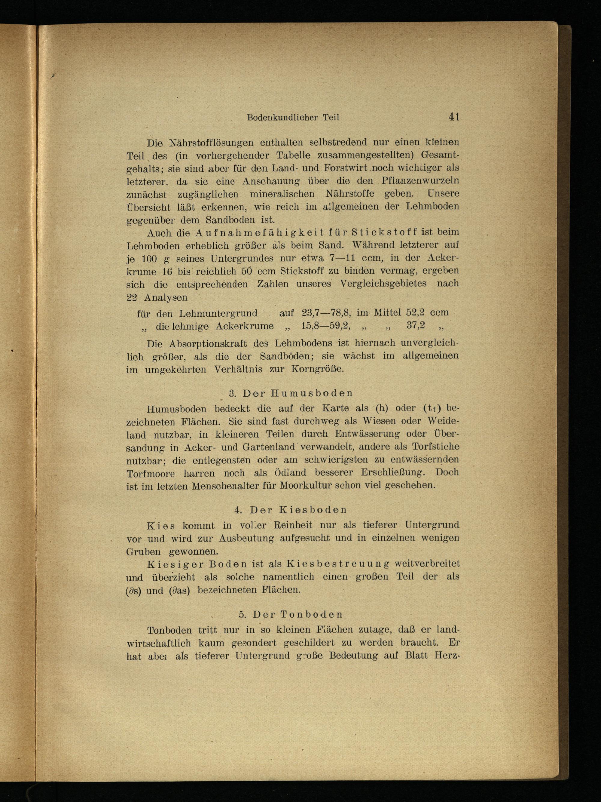 Auch die Aufnahmefähigkeitfür Stickstoff ist beim Lehmboden erheblich größer als beim Sand. Während letzterer auf je 100 g seines Untergrundes nur etwa 7—11 ccm, in der Ackerkrume 16 bis reichlich 50 ccm Stickstoff zu binden vermag, ergeben sich die entsprechenden Zahlen unseres Vergleichsgebietes nach 22 Analysen