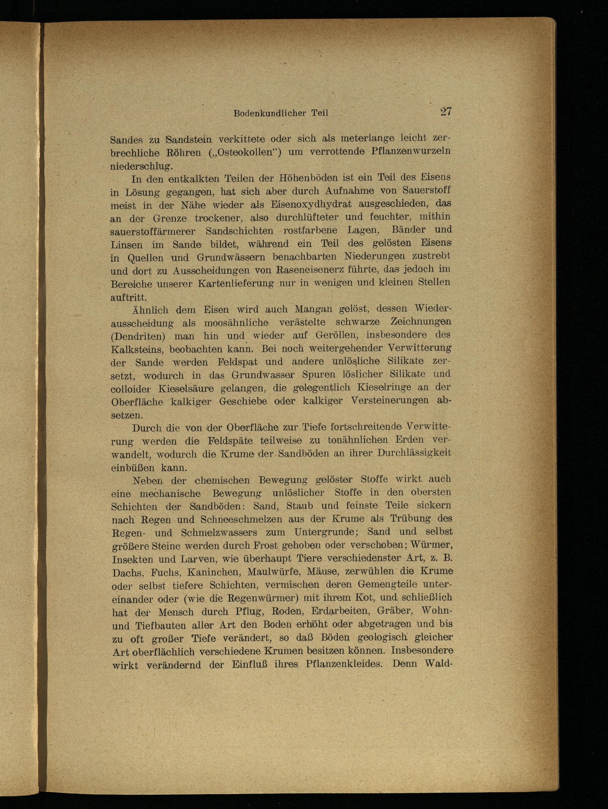 Neben der chemischen Bewegung gelöster Stoffe wirkt auch eine mechanische Bewegung unlöslicher Stoffe in den obersten Schichten der Sandböden: Sand, Staub und feinste Teile sickern nach Regen ‚und Schneeschmelzen aus der Krume als Trübung des Regen- und Schmelzwassers zum Untergrunde; Sand und selbst größere Steine werden durch Frost gehoben oder verschoben; Würmer, Insekten und Larven, wie überhaupt Tiere verschiedenster Art, z. B. Dachs, Fuchs, Kaninchen, Maulwürfe, Mäuse, zerwühlen’‘ die Krume oder selbst tiefere Schichten, vermischen deren Gemengteile untereinander oder(wie die Regenwürmer) mit ihrem Kot, und schließlich hat der Mensch durch Pflug, Roden, Erdarbeiten, Gräber, Wohnund Tiefbauten aller Art den Boden erhöht oder abgetragen und bis zu oft großer Tiefe verändert, so daß, Böden geologisch gleicher Art oberflächlich verschiedene Krumen besitzen können. Insbesondere wirkt verändernd der. Einfluß ihres Pflanzenkleides. Denn Wald