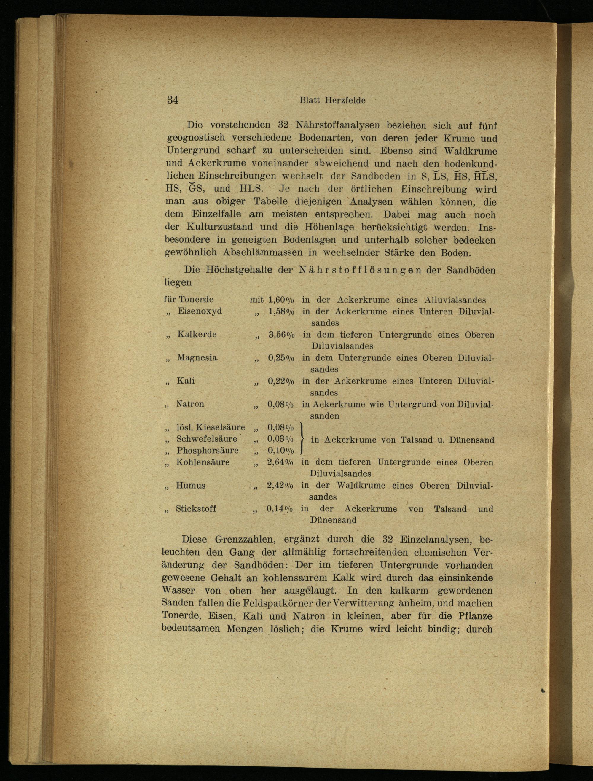 Die vorstehenden 32 Nährstoffanalysen beziehen sich auf fünf geognostisch verschiedene Bodenarten, von deren jeder Krume und Untergrund scharf zu unterscheiden sind. Ebenso sind Waldkrume und Ackerkrume voneinander abweichend und nach den bodenkundlichen Einschreibungen wechselt der Sandboden in S, LS, HS, HLS, HS, Gs, und HLS.‘ Je nach der örtlichen Einschreibung wird man ‚aus obiger Tabelle diejenigen Analysen wählen können, die dem Einzelfalle am meisten entsprechen. Dabei mag auch noch. der Kulturzustand und die Höhenlage berücksichtigt werden. Insbesondere in geneigten Bodenlagen und unterhalb solcher bedecken gewöhnlich Abschlämmassen in wechselnder Stärke den Boden.