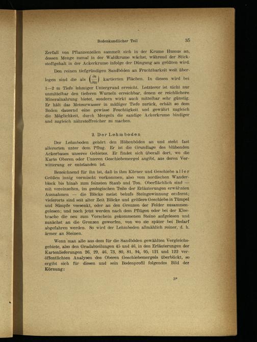 Der Lehmboden gehört. den Höhenböden an und steht fast allerorten. unter dem Pflug. Er ist die Grundlage. des blühenden Ackerbaues unseres Gebietes. Er findet sich überall dort, wo die Karte Oberen oder Unteren Geschiebemergel angibt, aus deren Verwitterung er entstanden ist.