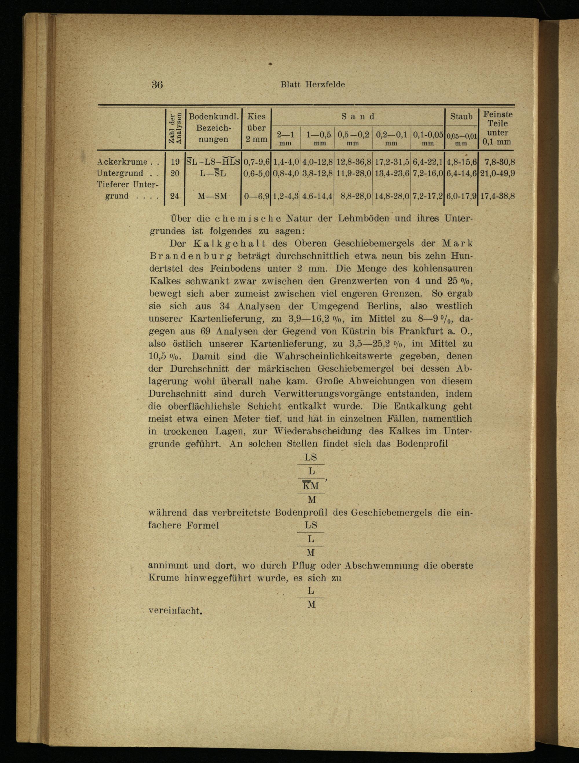 L KM M während das verbreitetste Bodenprofil des Geschiebemergels die einfachere Formel LS . L -M annimmt und dort, wo durch Pflug oder Abschwemmung die oberste Krume hinweggeführt wurde, es sich zu L