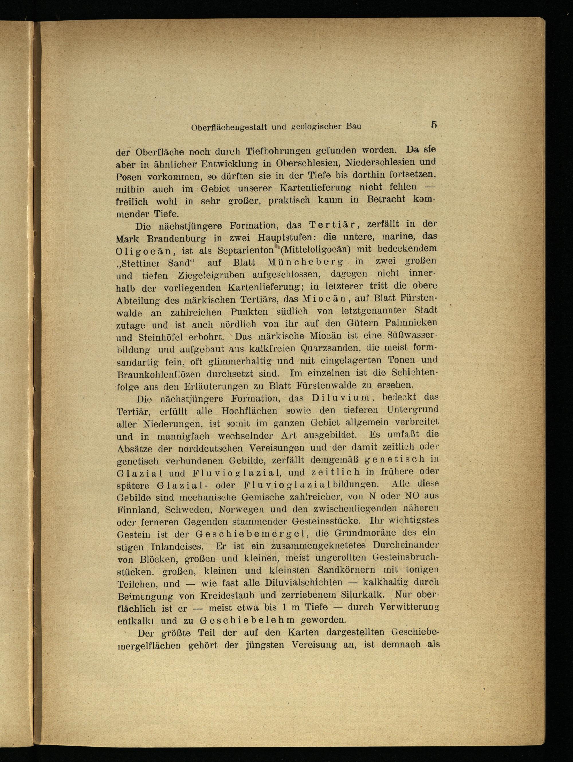 Die nächstjüngere Formation, das Tertiär, zerfällt in der Mark Brandenburg in zwei Hauptstufen: die untere, marine, das Oligocän, ist als Septarienton*(Mitteloligocän) mit bedeckendem „Stettiner Sand“ auf Blatt Müncheberg in Zwei großen und tiefen Ziegeleigruben aufgeschlossen, dagegen nicht innerhalb der vorliegenden Kartenlieferung; in letzterer tritt die obere Abteilung des märkischen Tertiärs, das Miocän, auf Blatt Fürsten walde ar zahlreichen Punkten südlich von letztgenannter Stadt zutage und ist auch nördlich von ihr auf den Gütern Palmnicken und Steinhöfel erbohrt. Das märkische Miocän ist eine Süßwasserbildung und aufgebaut aus kalkfreien Quarzsanden, die meist formsandartig fein, oft glimmerhaltig und mit eingelagerten Tonen und Braunkohlenflözen durchsetzt sind. Im einzelnen ist die Schichtenfolge aus den Erläuterungen zu Blatt Fürstenwalde zu ersehen.