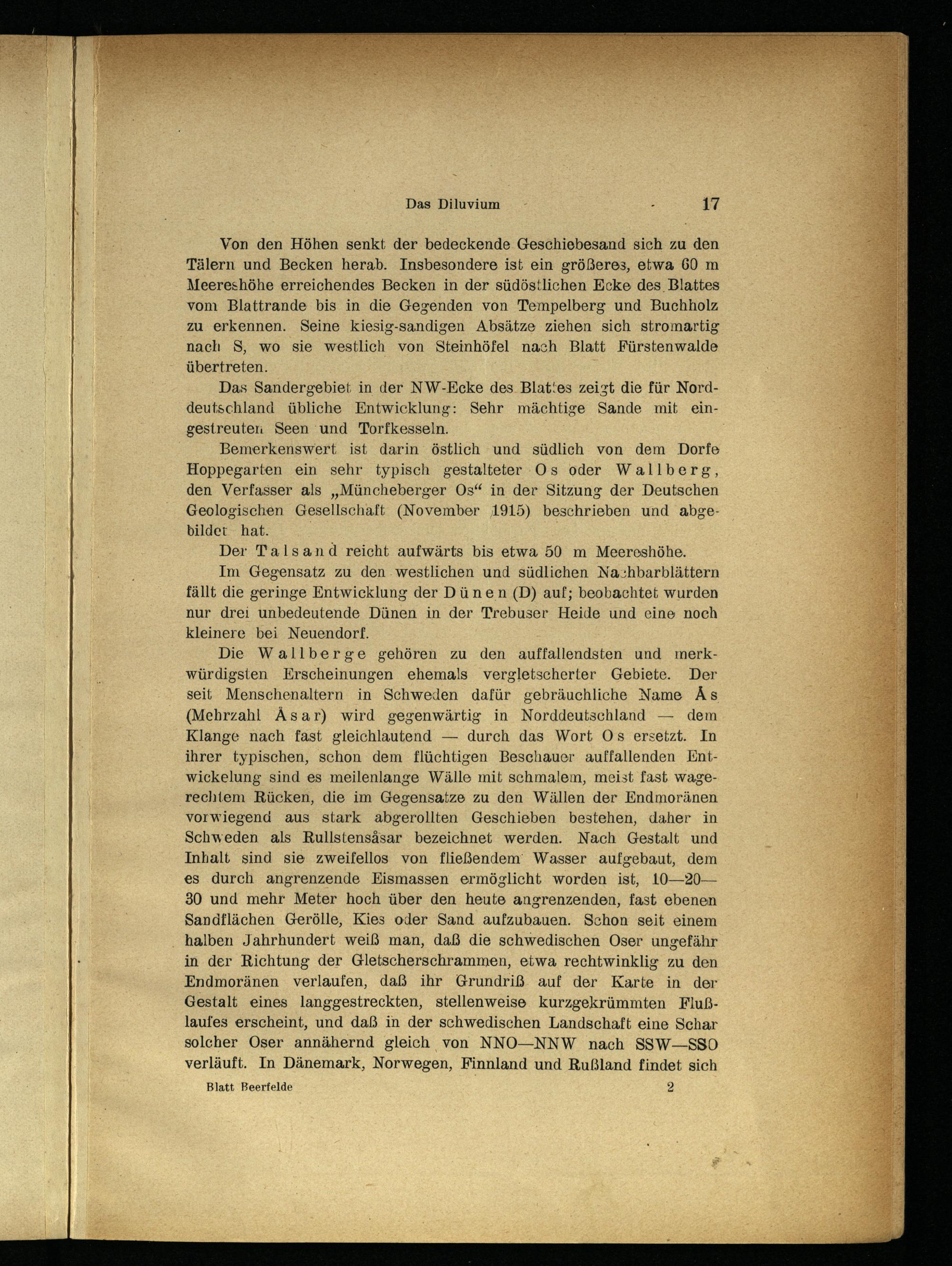 Bemerkenswert ist darin östlich und südlich von dem Dorfe Hoppegarten ein sehr typisch gestalteter Os oder Wallberg, den Verfasser als„Müncheberger Os“ in der Sitzung der Deutschen Geologischen Gesellschaft(November 1915) beschrieben und abgebildet hat.