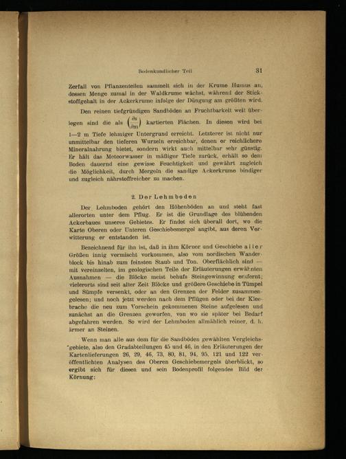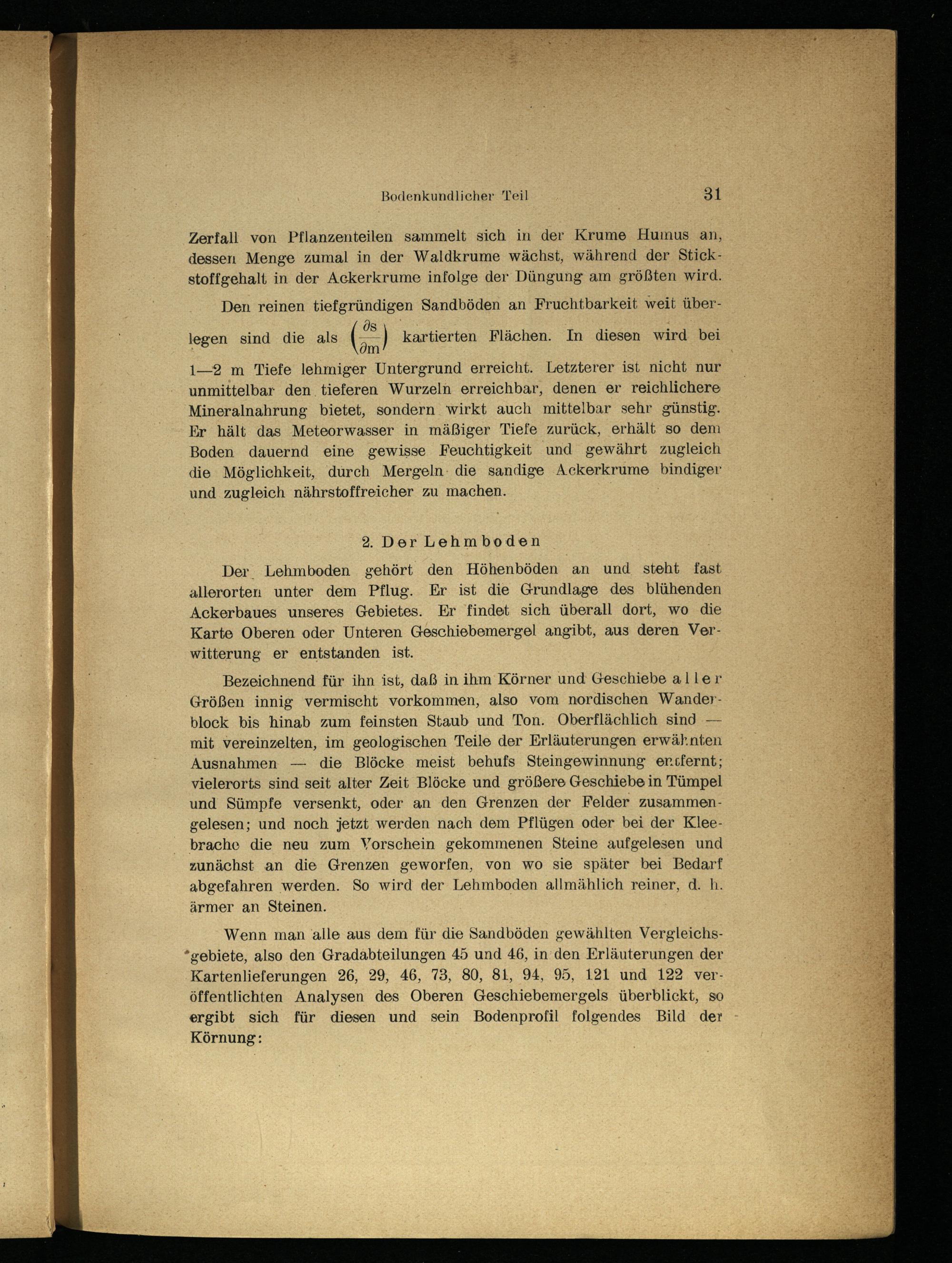 Der. Lehmboden gehört den Höhenböden an und steht fast allerorten unter dem Pflug. Er ist die Grundlage des blühenden Ackerbaues unseres Gebietes. Er findet sich überall dort, wo die Karte Oberen oder Unteren Geschiebemergel angibt, aus deren Verwitterung er entstanden ist.