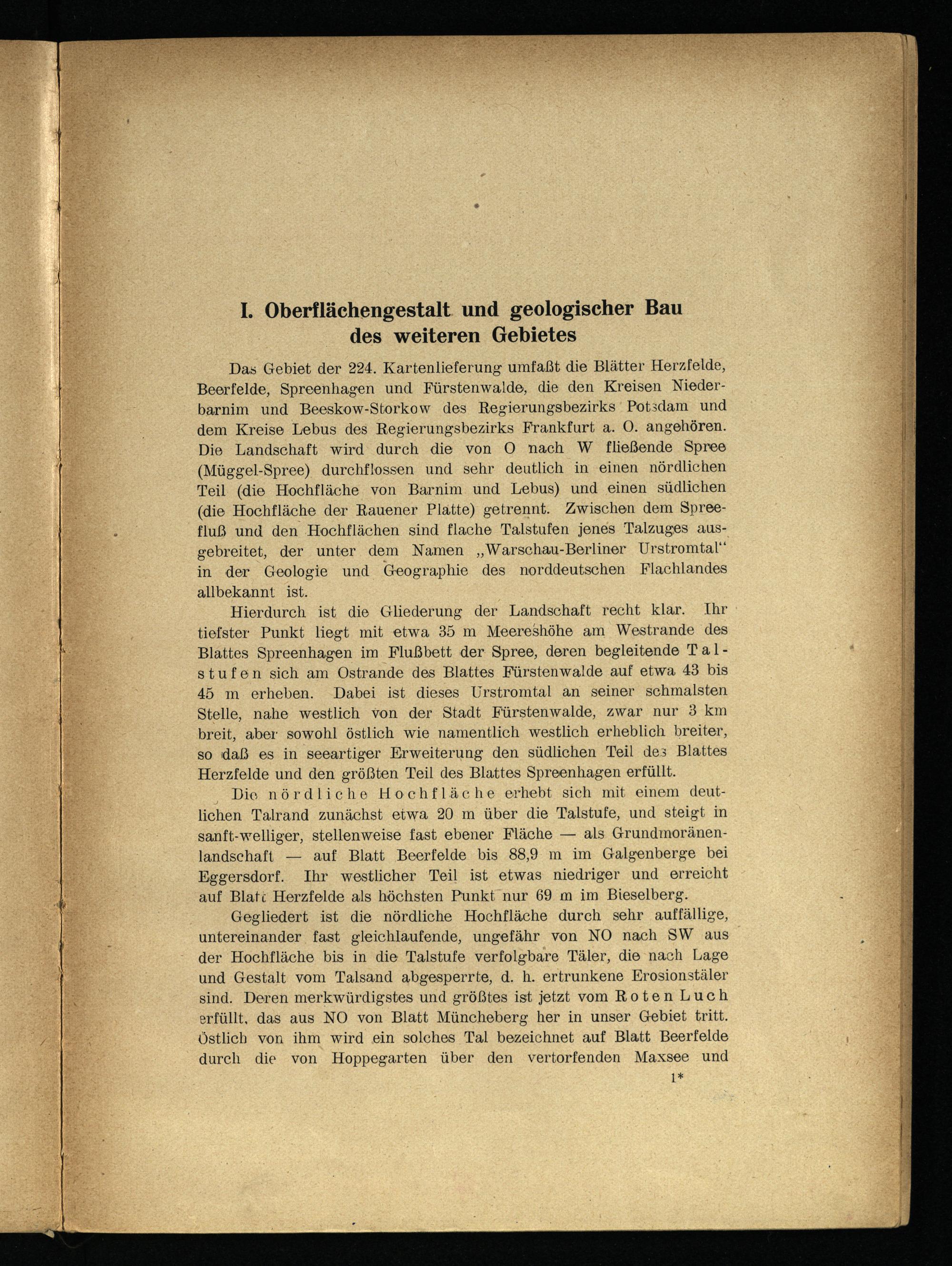 Das Gebiet der 224. Kartenlieferung umfaßt die Blätter Herzfelde , Beerfelde , Spreenhagen und Fürstenwalde , die den Kreisen Nieder barnim und Beeskow-Storkow des Regierungsbezirks Potsdam und dem Kreise Lebus des Regierungsbezirks Frankfurt a. O. angehören. Die Landschaft wird durch die von O nach W fließende Spree (Müggel-Spree) durchflossen und sehr deutlich in einen nördlichen Teil(die Hochfläche von Barnim und Lebus ) und einen südlichen (die Hochfläche der Rauener Platte) getrennt. Zwischen dem Spreefluß und den Hochflächen sind flache Talstufen jenes Talzuges ausgebreitet, der unter. dem Namen„Warschau-Berliner Urstromtal‘ in der Geologie und Geographie des norddeutschen Flachlandes allbekannt ist.