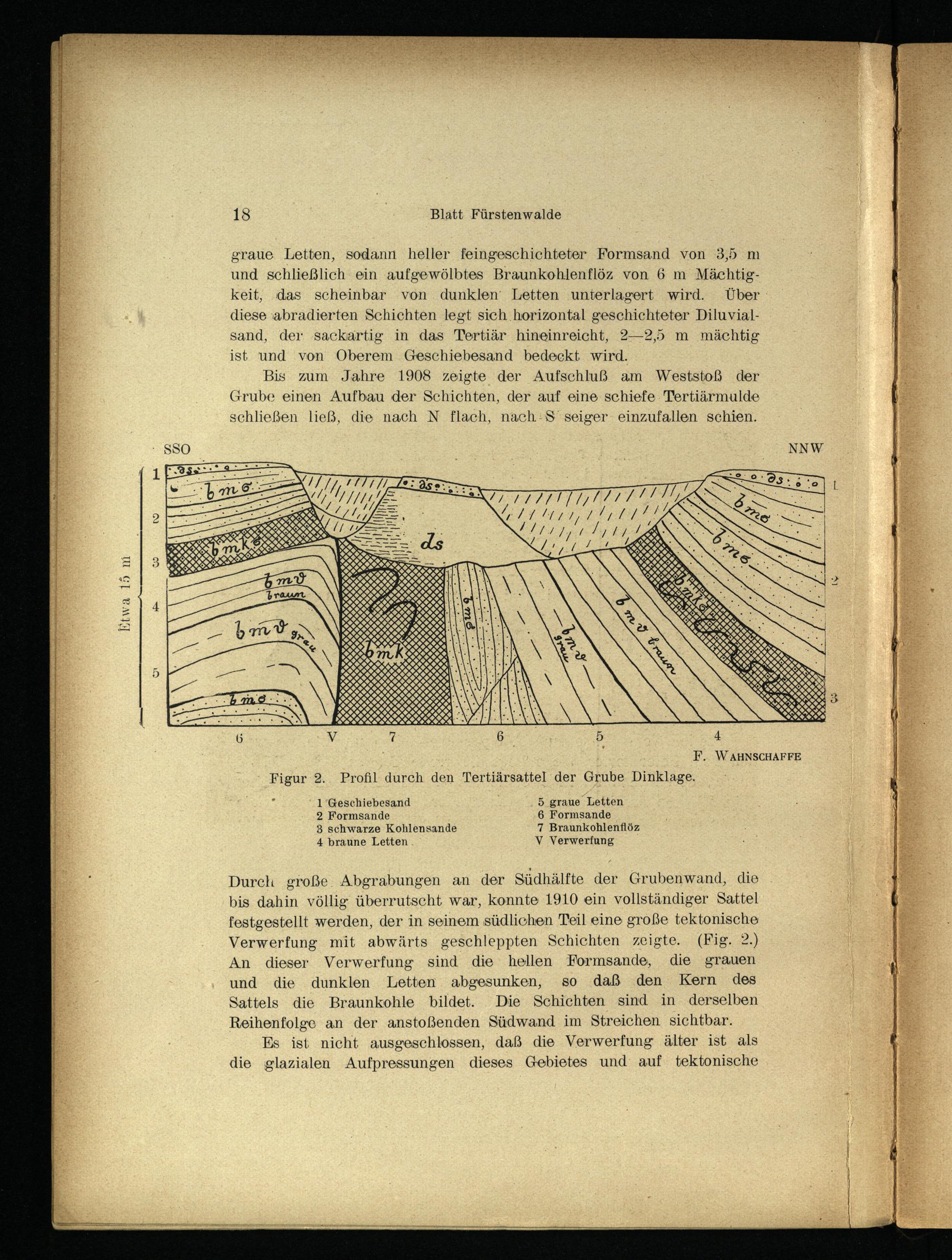 Durch große. Abgrabungen an der Südhälfte der Grubenwand, die bis dahin völlig überrutscht war, konnte 1910 ein vollständiger Sattel festgestellt werden, der in seinem südlichen Teil eine große tektonische Verwerfung mit abwärts geschleppten Schichten zeigte.(Fig. 2.) An dieser Verwerfung sind die hellen Formsande, die grauen und die dunklen Letten abgesunken, so daß den Kern des Sattels die Braunkohle bildet. Die Schichten sind in derselben Reihenfolge an der anstoßenden Südwand im Streichen sichtbar. Es ist nicht ausgeschlossen, daß die Verwerfung älter ist als die glazialen Aufpressungen dieses Gebietes und auf tektonische