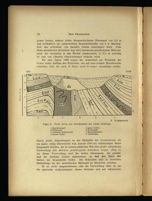 Bis zum Jahre 1908 zeigte der Aufschluß am Weststoß der Grube einen Aufbau der Schichten, der auf eine schiefe Tertiärmulde schließen ließ, die nach N flach, nach:$’ seiger einzufallen schien.