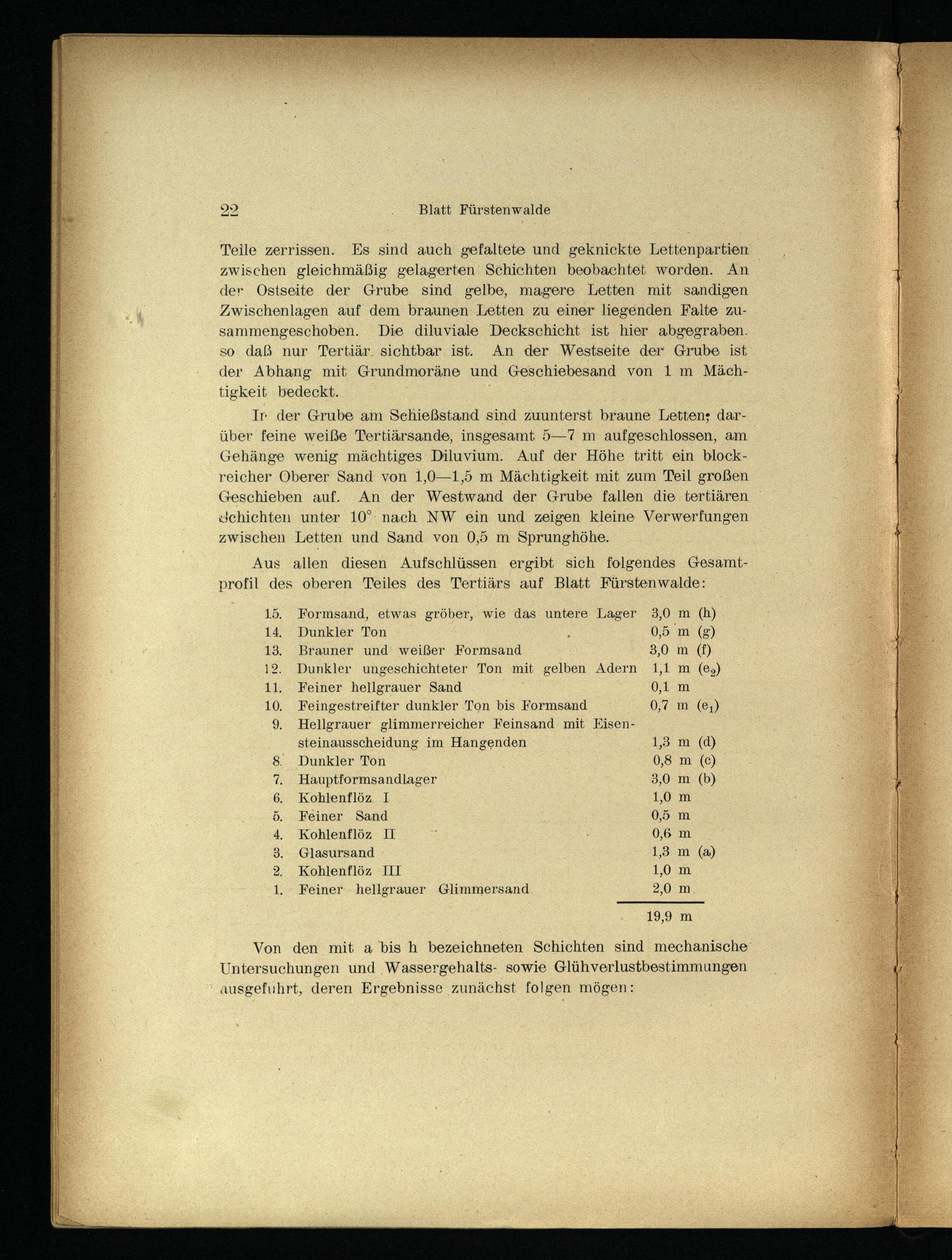 15. Formsand, etwas gröber, wie das untere Lager 3,0 m(h) 14. Dunkler. Ton. 0,5 m(g 13. Brauner und’ weißer Formsand 3,0 m(f) 12. Dunkler ungeschichteter Ton mit gelben Adern 1,1 m(es) 11. Feiner hellgrauer Sand 0,1 10. Feingestreifter dunkler Ton bis Formsand 0,7 m(e;) 9. Hellgrauer glimmerreicher Feinsand mit KEisensteinausscheidung im Hangenden 1,3(d) Dunkler Ton 0,8(c) Hauptformsandlager 3,0(b) Kohlenflöz I 1,0 Feiner Sand 0,5 Kohlenflöz IL 0,6 Glasursand 1,3 Kohlenflöz ILI 1,0 Feiner- hellgrauer Glimmersand 2,0