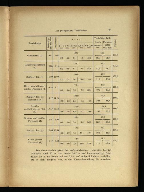 Die Gesamtmächtigkeit der aufgeschlossenen Schichten beträgt demnach. rund 20 m, von denen 14,2 m auf formsandartige feine Sande, 2,6 m auf Kohle und nur 3,1 m auf tonige Schichten entfallen. Da es nicht möglich war, in der Kartendarstellung die einzelnen