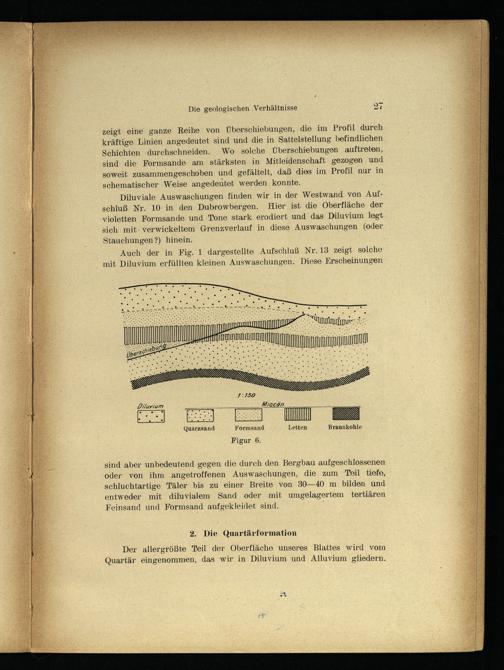 zeigt eine ganze Reihe von Überschiebungen, die im Profil durch kräftige Linien angedeutet sind und die in Sattelstellung befindlichen Schichten durchschneiden. Wo solche Überschiebungen auftreten, sind die Formsande am stärksten in Mitleidenschaft gezogen und soweit zusammengeschoben und gefältelt, daß dies im Profil nur in schematischer Weise angedeutet werden konnte.