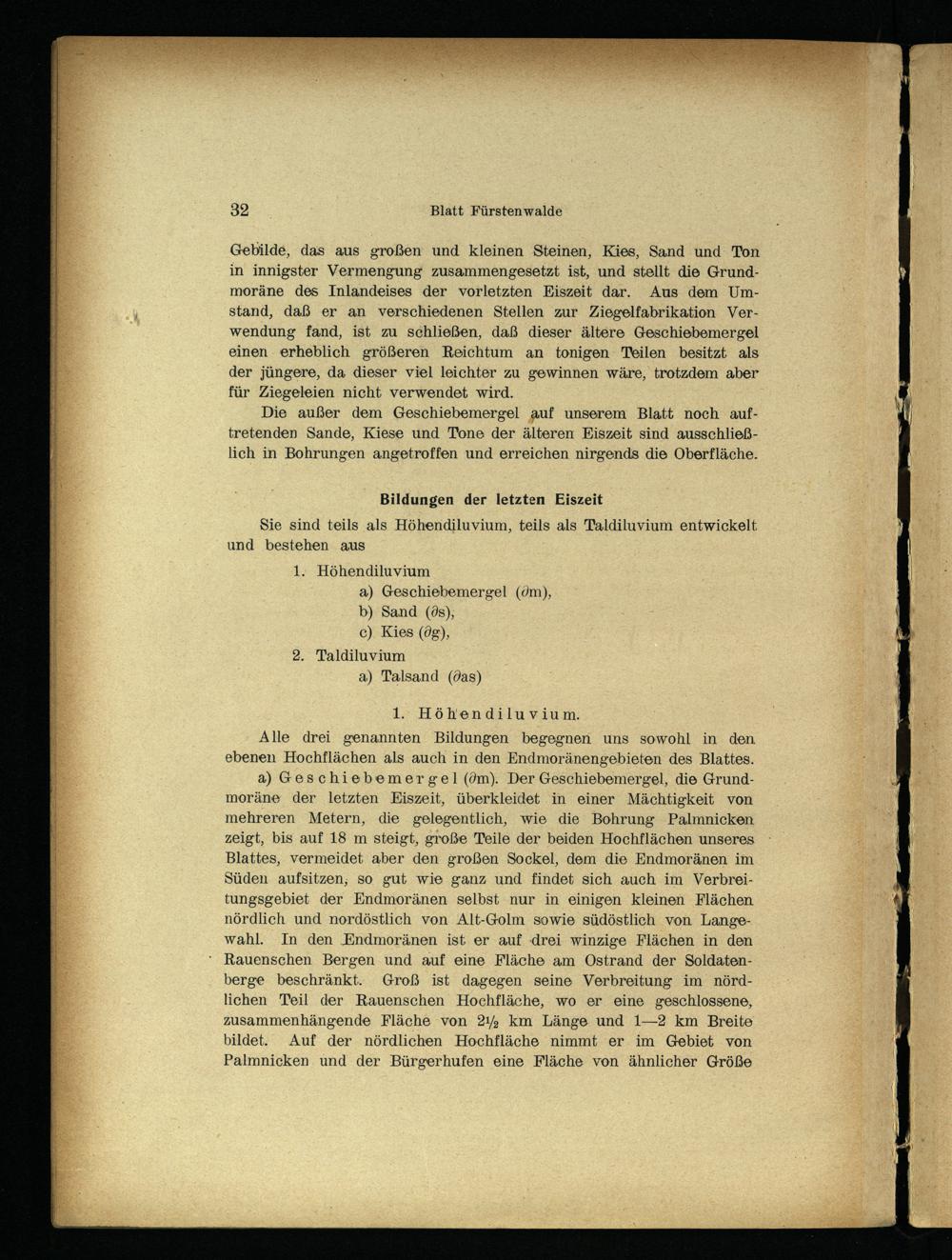 1. Höhendiluvium a) Geschiebemergel(0m), b) Sand(0s); c). Kies(0g), 2. Taldiluvium a) Talsand(das)