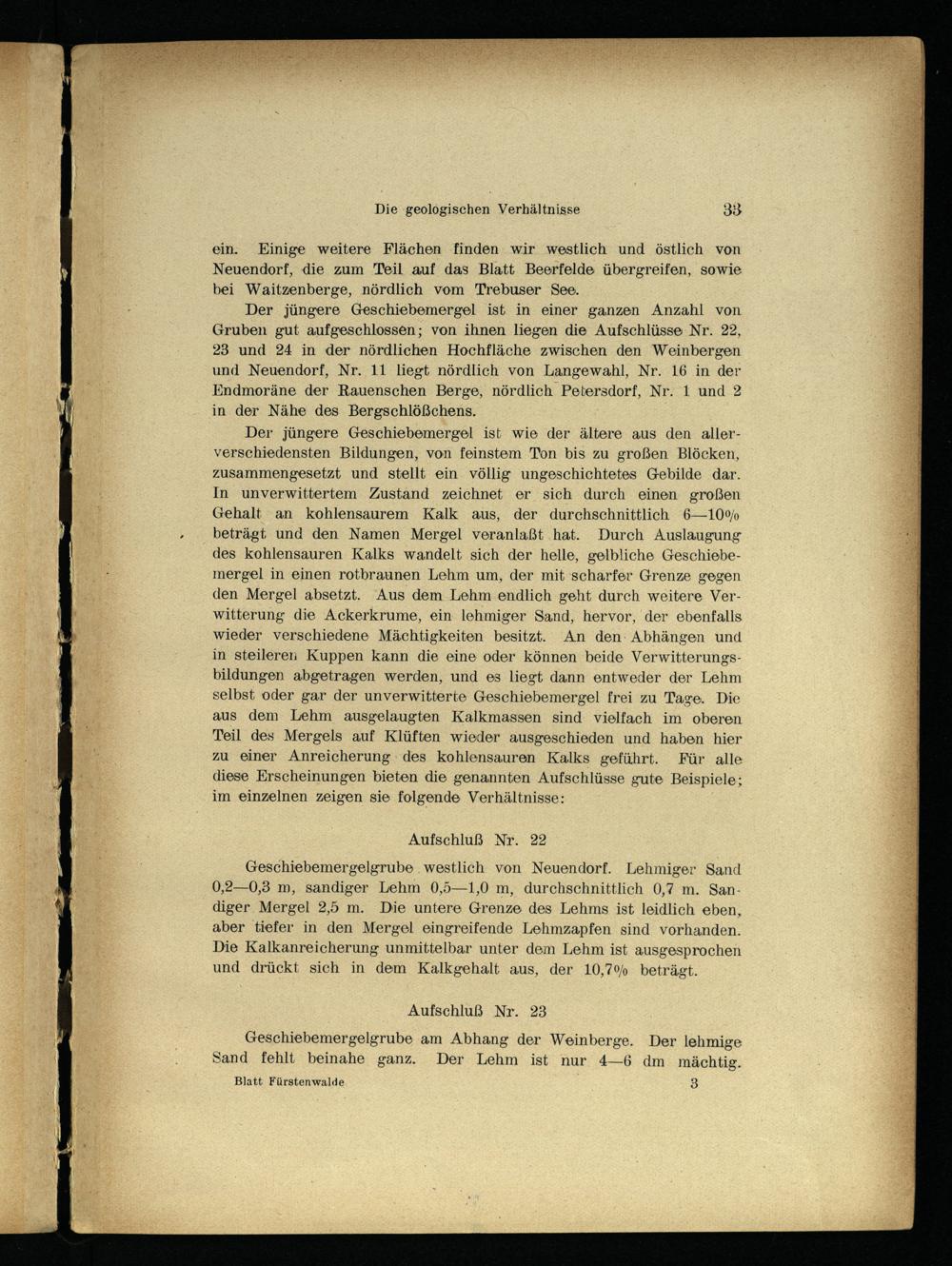 Der. jüngere Geschiebemergel ist in einer ganzen Anzahl von Gruben gut aufgeschlossen; von ihnen liegen die Aufschlüsse Nr. 22, 23 und 24 in der nördlichen Hochfläche zwischen den Weinbergen und Neuendorf, Nr. 11 liegt nördlich von Langewahl, Nr. 16 in der Endmoräne der Rauenschen Berge, nördlich Petersdorf, Nr. 1 und 2 in der Nähe des Bergschlößchens.