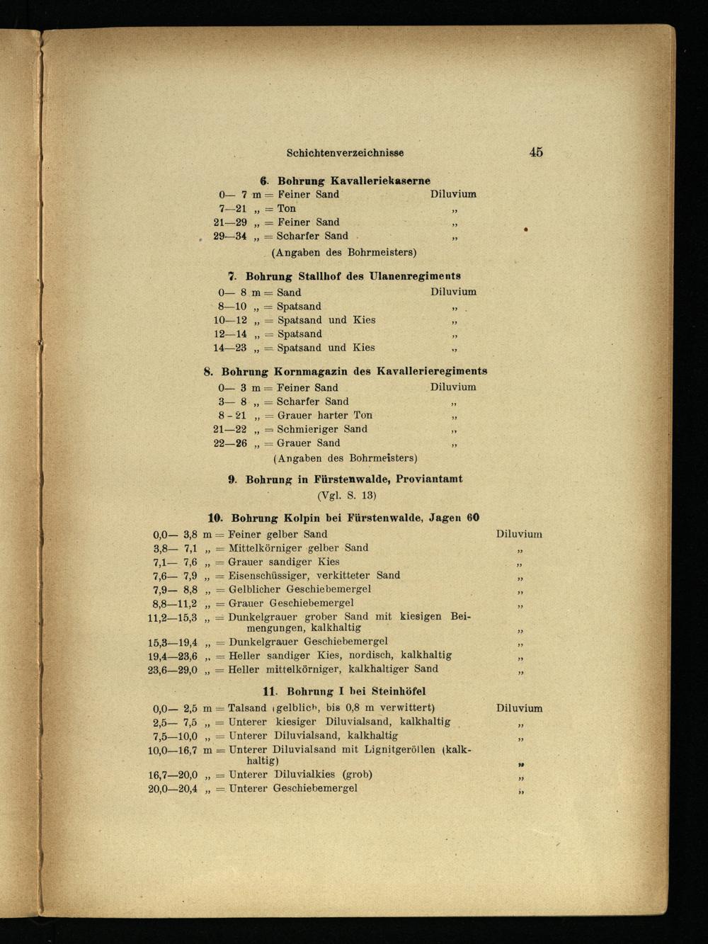 0— 8 m= Sand Diluvium 8—10 ‚„,= Spatsand ye 10—12 ,,= Spatsand und Kies» 12—14„= Spatsand 14—23 ‚= Spatsand und Kies 7 8. Bohrung Kornmagazin des Kavallerieregiments