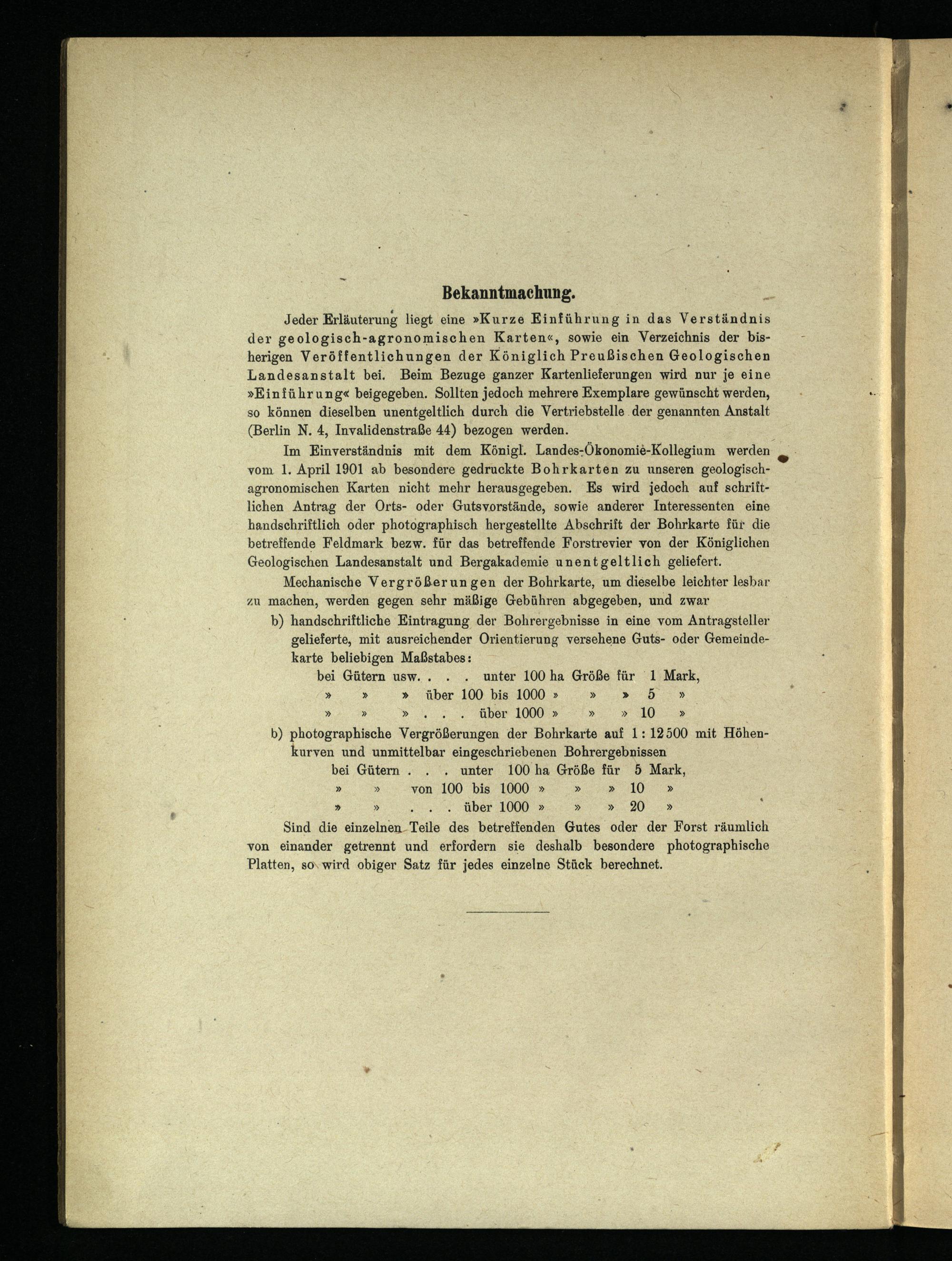 Im Einverständnis mit dem Königl. Landes-Ökonomie-Kollegium werden vom 1. April 1901 ab besondere gedruckte Bohrkarten zu unseren geologischagronomischen Karten nicht mehr herausgegeben. Es wird jedoch auf schriftlichen Antrag der Orts- oder Gutsvorstände, sowie anderer Interessenten eine handschriftlich oder photographisch hergestellte Abschrift der Bohrkarte für die betreffende Feldmark bezw. für das betreffende Forstrevier von der Königlichen Geologischen Landesanstalt und Bergakademie unentgeltlich geliefert.
