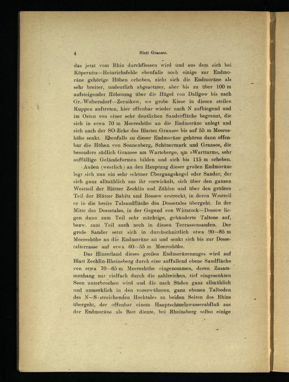 sehr breiter, undeutlich abgesetzter, aber bis zu über 100 m aufsteigender Höhenzug über die Hügel von Dallgow bis nach Gr.-Woltersdorf—Zernikow, wo grobe Kiese in diesen steilen Kuppen auftreten, hier offenbar wieder nach N aufbiegend und im Osten von einer sehr deutlichen Sanderfläche begrenzt, die sich‘ in etwa 70 m Meereshöhe an die Endmoräne anlegt und sich nach der SO-Ecke des Blattes Gransee bis auf 55 m Meereshöhe senkt... Ebenfalls zu dieser Endmoräne gehören dann offenbar die Höhen von Sonnenberg, Schönermark und Gransee , die besonders südlich Gransee am Warteberge, am»Wartturm«, sehr auffällige Geländeformen bilden und sich bis 115 m erheben.