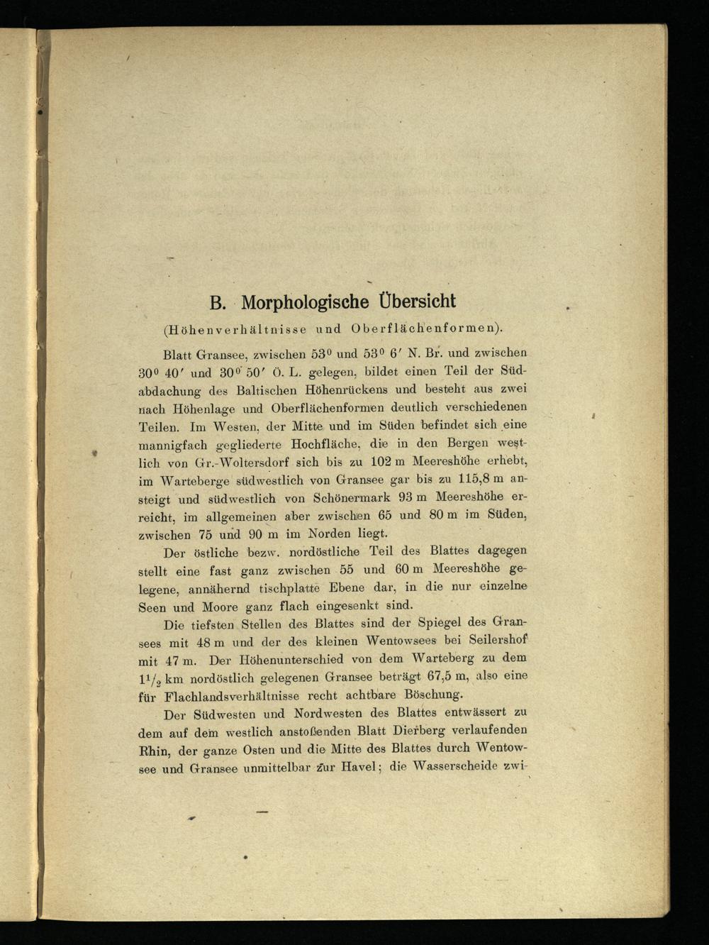 Blatt Gransee , zwischen 53° und 53° 6’ N. Br. und zwischen 309° 40’ und 30% 50’ Ö. L. gelegen, bildet einen Teil der Südabdachung des Baltischen Höhenrückens und besteht aus zwei nach Höhenlage und Oberflächenformen deutlich verschiedenen Teilen. Im Westen, der Mitte und im Süden befindet sich eine mannigfach gegliederte Hochfläche, die in den Bergen westlich von Gr.-Woltersdorf sich bis zu 102 m Meereshöhe erhebt, im Warteberge südwestlich von Gransee gar bis zu 115,8 m ansteigt und südwestlich von Schönermark 93 m Meereshöhe erreicht, im allgemeinen aber zwischen 65 und 80m im Süden, zwischen 75 und 90 m im Norden liegt.