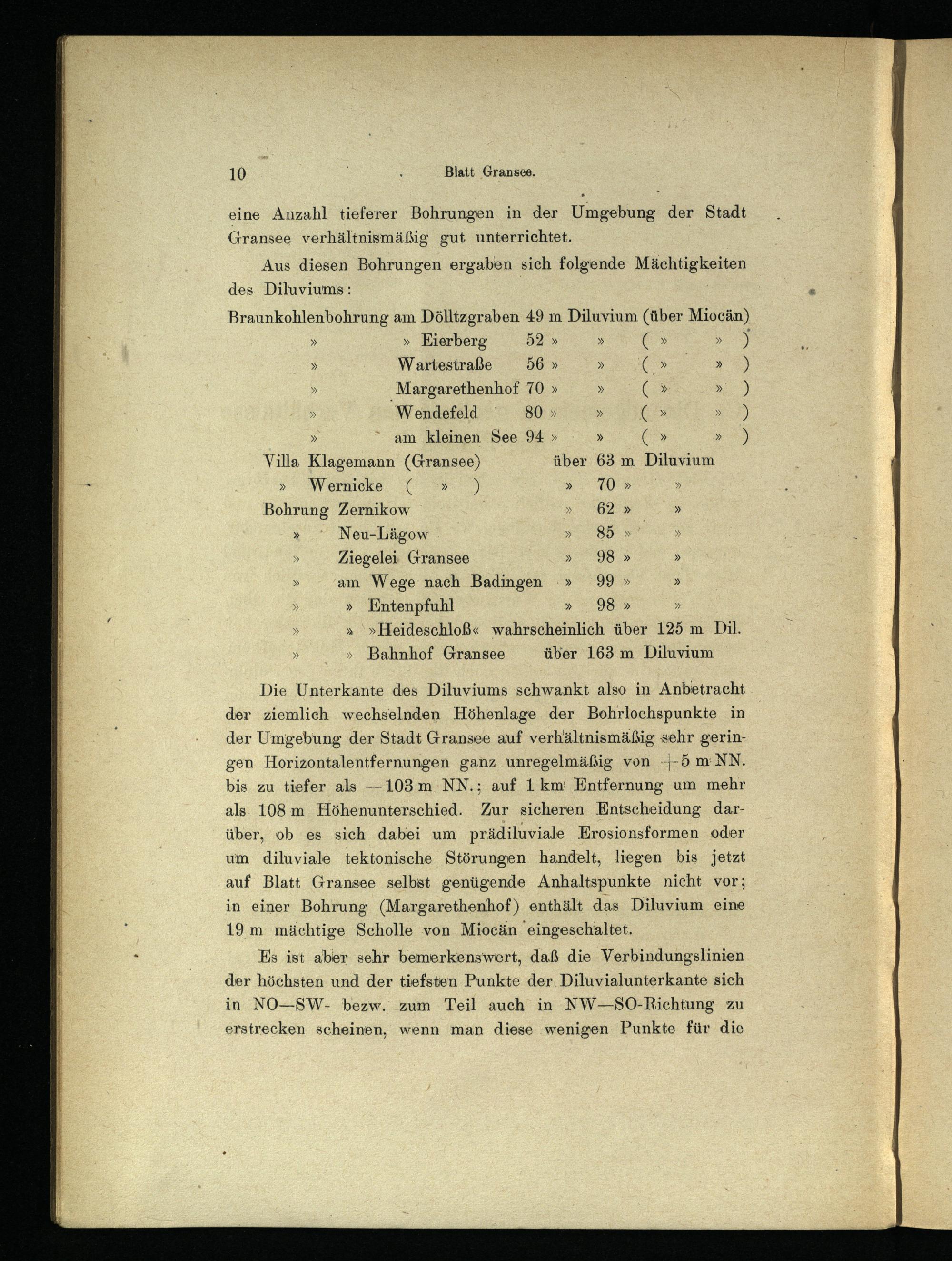 eine Anzahl tieferer Bohrungen in der Umgebung der Stadt Gransee verhältnismäßig gut unterrichtet. Aus diesen Bohrungen ergaben sich folgende Mächtigkeiten des Diluviums: Braunkohlenbohrung am Dölltzgraben 49 m Diluvium(über Miocän) » KEierberg d2»»() Wartestraße 56»»( Margarethenhof 70»»( Wendefeld 80»» C am kleinen See 94»»€ Villa Klagemann(Gransee ) über 63 m Diluvium » Wemicke(x) 70» Bohrung Zernikow;» 62» » Neu-Lägow 85» » Ziegelei Gransee 98» » am Wege nach Badingen 99» »» Entenpfuhl 98»» »»»Heideschloß« wahrscheinlich über 125 m Dil. »» Bahnhof Gransee über 163 m Diluvium