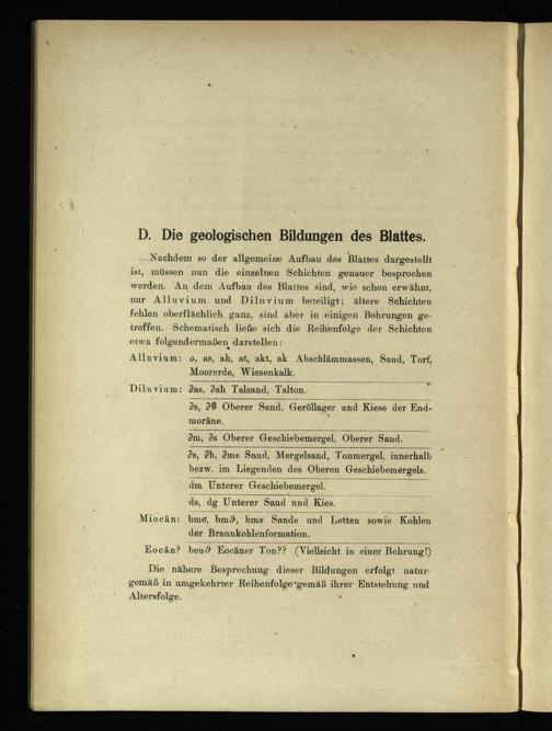 Nachdem so der allgemeine Aufbau des Blattes dargestellt ist, müssen nun die einzelnen Schichten genauer besprochen werden. An dem Aufbau des Blattes sind, wie schon erwähnt, nur Alluvium und Diluvium beteiligt; ältere Schichten fehlen oberflächlich ganz, sind aber in einigen Bohrungen getroffen. Schematisch ließe sich die Reihenfolge der Schichten etwa folgendermaßen darstellen: