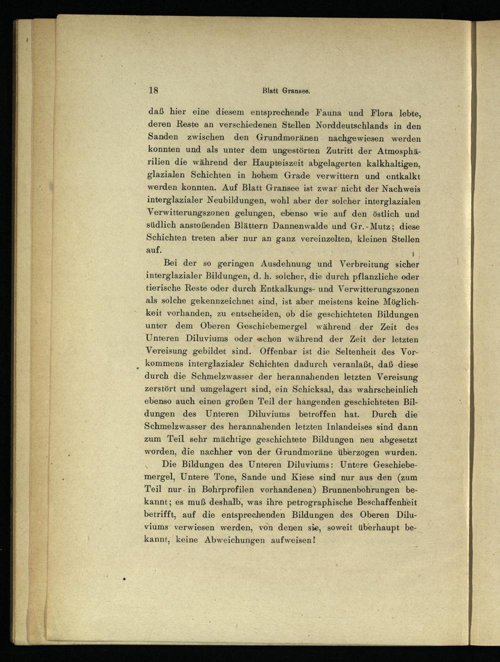 daß hier eine diesem entsprechende Fauna und Flora lebte, deren Reste an verschiedenen Stellen Norddeutschlands in den Sanden zwischen den Grundmoränen nachgewiesen werden konnten und als unter dem ungestörten Zutritt der Atmosphärilien die während der Haupteiszeit abgelagerten kalkhaltigen, glazialen Schichten in hohem Grade verwittern und entkalkt werden konnten. Auf Blatt Gransee ist zwar nicht der Nachweis interglazialer Neubildungen, wohl aber der solcher interglazialen Verwitterungszonen gelungen, ebenso wie auf den östlich und südlich anstoßenden Blättern Dannenwalde und Gr.-Mutz; diese Schichten treten aber nur an ganz vereinzelten, kleinen Stellen auf.- A Or Bei der so geringen Ausdehnung und Verbreitung sicher